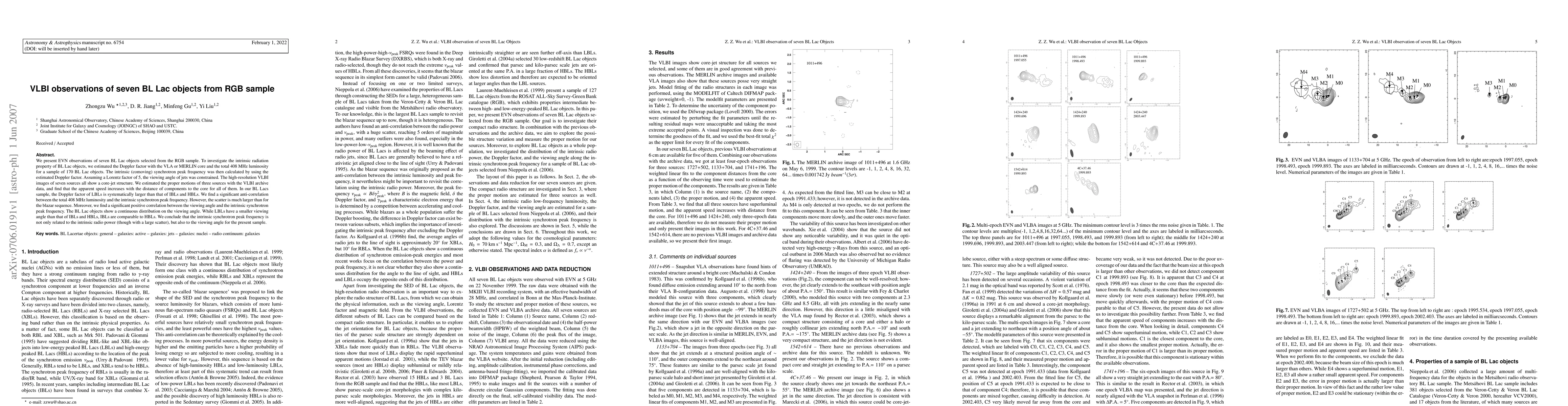We present EVN observations of seven BL Lac objects selected from the RGB sample. To investigate the intrinsic radiation property of BL Lac objects, we estimated the Doppler factor with the VLA or MERLIN core and the total 408 MHz luminosity for a sample of 170 BL Lac objects. The intrinsic (comoving) synchrotron peak frequency was then calculated by using the estimated Doppler factor. Assuming a Lorentz factor of 5, the viewing angle of jets was constrained. The high-resolution VLBI images of seven sources all show a core-jet structure. We estimated the proper motions of three sources with the VLBI archive data, and find that the apparent speed increases with the distance of components to the core for all of them. In our BL Lacs sample, the Doppler factor of LBLs is systematically larger than that of IBLs and HBLs. We find a significant anti-correlation between the total 408 MHz luminosity and the intrinsic synchrotron peak frequency. However, the scatter is much larger than for the blazar sequence. Moreover, we find a significant positive correlation between the viewing angle and the intrinsic synchrotron peak frequency. The BL Lac objects show a continuous distribution on the viewing angle. While LBLs have a smaller viewing angle than that of IBLs and HBLs, IBLs are comparable to HBLs. We conclude that the intrinsic synchrotron peak frequency is not only related to the intrinsic radio power (though with a large scatter), but also to the viewing angle for the present sample.