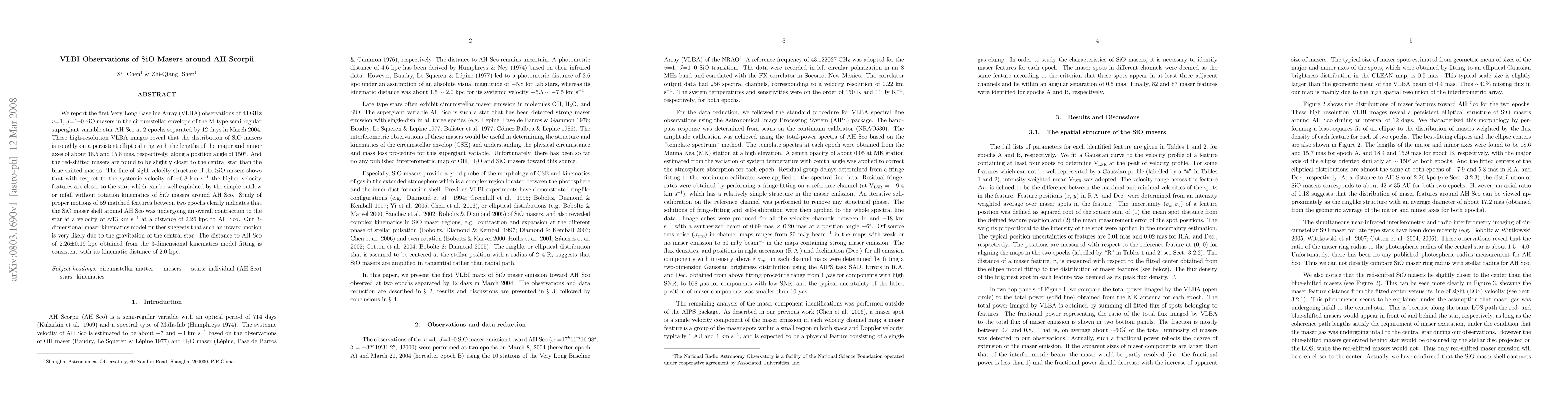 This study reports the first VLBA observations of SiO masers around the M-type semi-regular variable star AH Sco, revealing a persistent elliptical ring distribution. The masers show an inward motion towards the star, suggesting gravitational influence, with a contraction velocity of ~13 km/s.