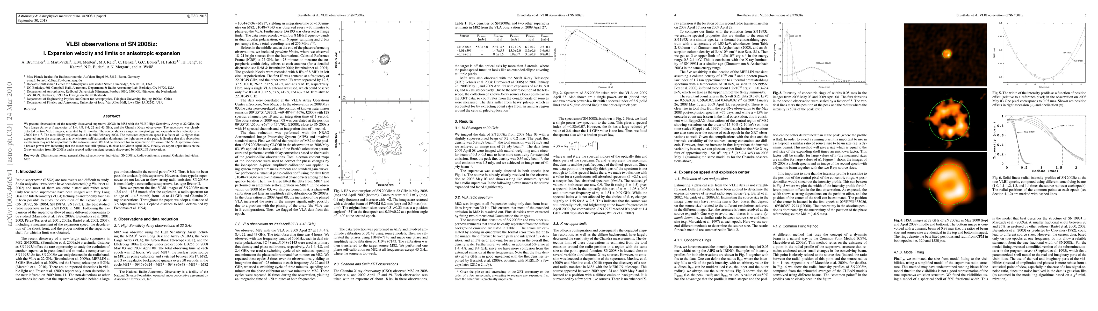 We present observations of the recently discovered supernova 2008iz in M82 with the VLBI High Sensitivity Array at 22 GHz, the Very Large Array at frequencies of 1.4, 4.8, 8.4, 22 and 43 GHz, and the Chandra X-ray observatory. The supernova was clearly detected on two VLBI images, separated by 11 months. The source shows a ring-like morphology and expands with a velocity of ~23000 km/s. The most likely explosion date is in mid February 2008. The measured expansion speed is a factor of ~2 higher than expected under the assumption that synchrotron self-absorption dominates the light curve at the peak, indicating that this absorption mechanism may not be important for the radio emission. We find no evidence for an asymmetric explosion. The VLA spectrum shows a broken power law, indicating that the source was still optically thick at 1.4 GHz in April 2009. Finally, we report upper limits on the X-ray emission from SN 2008iz and a second radio transient recently discovered by MERLIN observations.