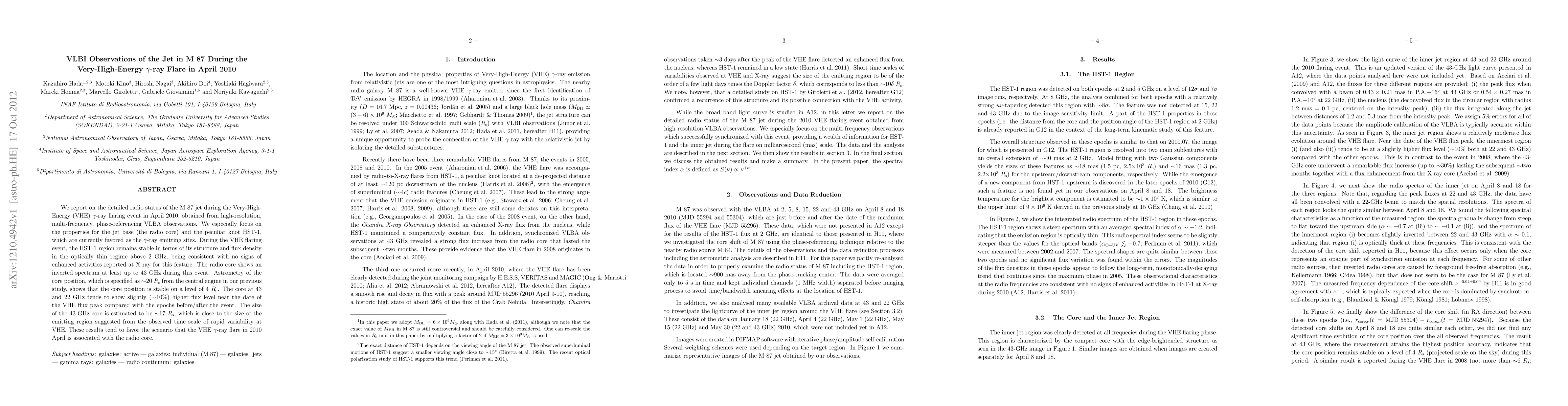This paper reports on high-resolution VLBA observations of M87's jet during a 2010 VHE gamma-ray flare, finding that the jet base and knot HST-1 showed stable structure and flux density, suggesting the radio core as the likely VHE gamma-ray emitting site. The core's position and size were stable, with slight flux increases near the VHE peak date.