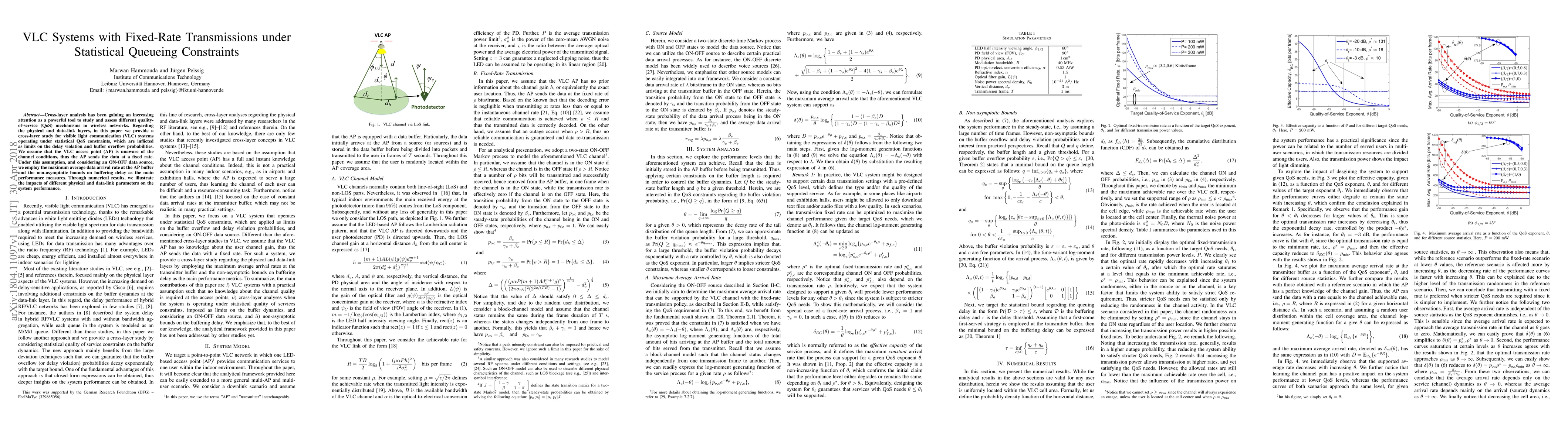 This paper conducts a cross-layer analysis of visible light communication (VLC) systems under statistical QoS constraints, focusing on fixed-rate transmissions without channel condition awareness. It evaluates performance based on buffer delay and overflow probabilities, revealing the effects of varying physical and data-link parameters on system efficiency.