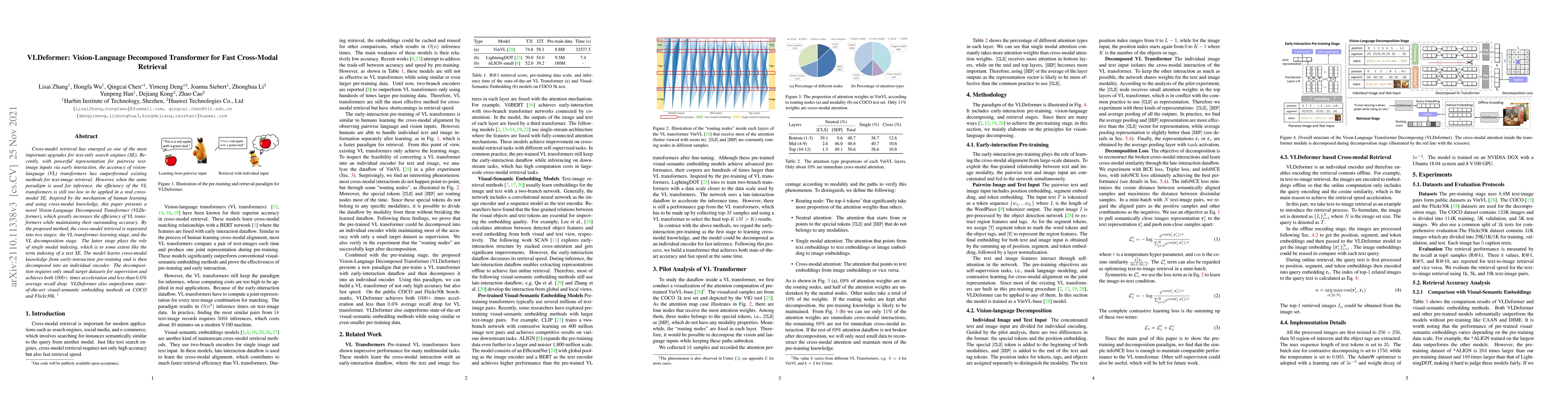 VLDeformer introduces a Vision-Language Decomposed Transformer to enhance the efficiency of cross-modal retrieval while preserving accuracy. It decomposes the VL transformer into individual encoders, achieving over 1000x speedup with minimal recall loss.