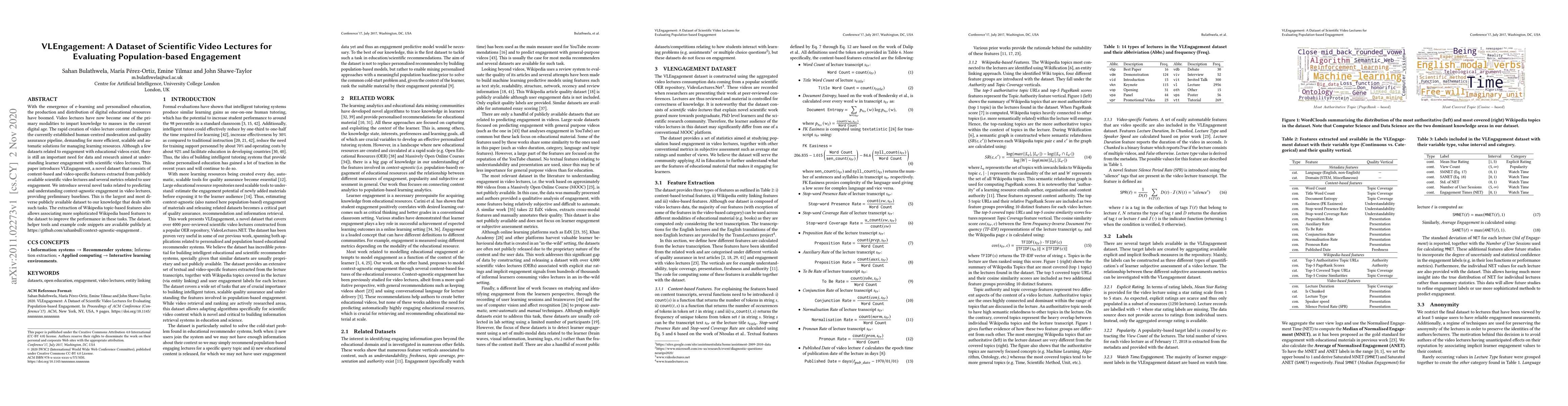 The VLEngagement dataset introduces a comprehensive collection of scientific video lectures, including content-based and video-specific features, along with user engagement metrics to evaluate population-based engagement. The dataset aims to facilitate research on predicting and understanding engagement in scientific video lectures, offering preliminary baselines and tools for analysis.