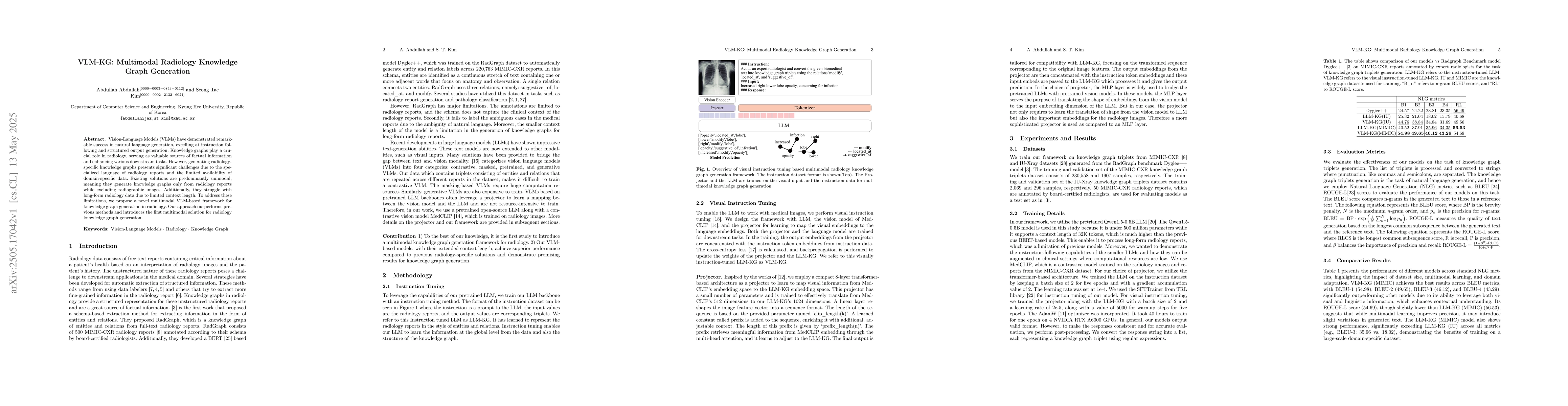 Vision-Language Models (VLMs) have demonstrated remarkable success in natural language generation, excelling at instruction following and structured output generation. Knowledge graphs play a crucial role in radiology, serving as valuable sources of factual information and enhancing various downstream tasks. However, generating radiology-specific knowledge graphs presents significant challenges due to the specialized language of radiology reports and the limited availability of domain-specific data. Existing solutions are predominantly unimodal, meaning they generate knowledge graphs only from radiology reports while excluding radiographic images. Additionally, they struggle with long-form radiology data due to limited context length. To address these limitations, we propose a novel multimodal VLM-based framework for knowledge graph generation in radiology. Our approach outperforms previous methods and introduces the first multimodal solution for radiology knowledge graph generation.