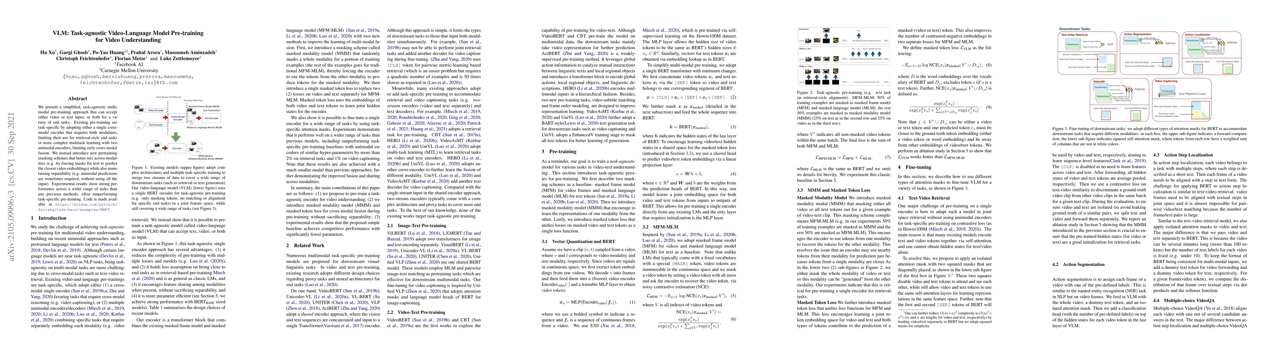 We present a simplified, task-agnostic multi-modal pre-training approach that can accept either video or text input, or both for a variety of end tasks. Existing pre-training are task-specific by adopting either a single cross-modal encoder that requires both modalities, limiting their use for retrieval-style end tasks or more complex multitask learning with two unimodal encoders, limiting early cross-modal fusion. We instead introduce new pretraining masking schemes that better mix across modalities (e.g. by forcing masks for text to predict the closest video embeddings) while also maintaining separability (e.g. unimodal predictions are sometimes required, without using all the input). Experimental results show strong performance across a wider range of tasks than any previous methods, often outperforming task-specific pre-training. Code is made available at https://github.com/pytorch/fairseq/tree/main/examples/MMPT.