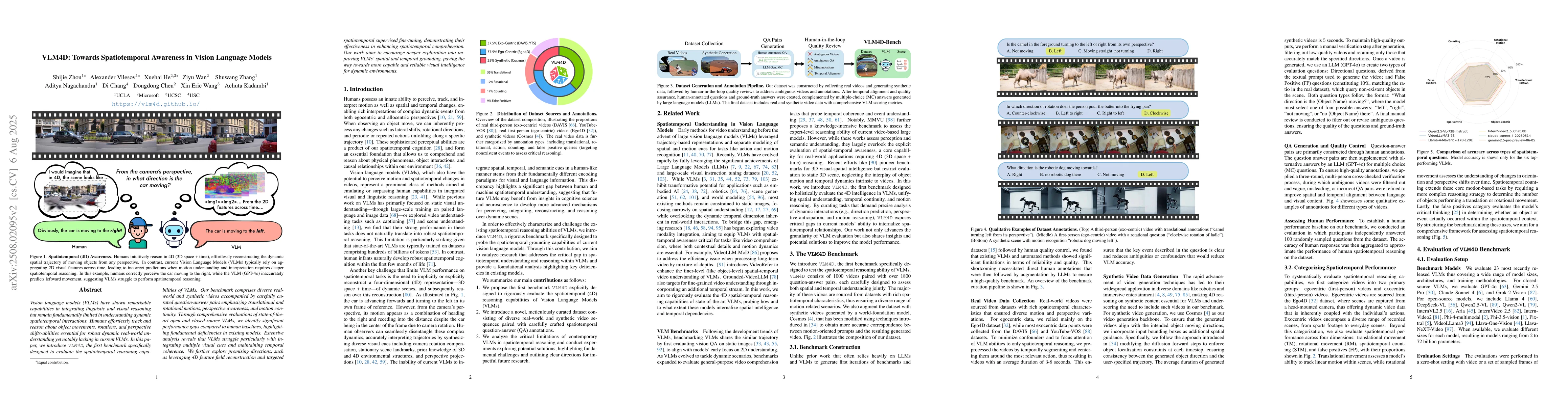 The paper introduces VLM4D, the first benchmark to assess spatiotemporal reasoning in Vision Language Models (VLMs). Evaluations reveal significant performance gaps in VLMs compared to human baselines, especially in integrating visual cues and maintaining temporal coherence. The paper suggests methods like 4D feature field reconstruction and targeted supervised fine-tuning to improve VLMs' spatiotemporal understanding.