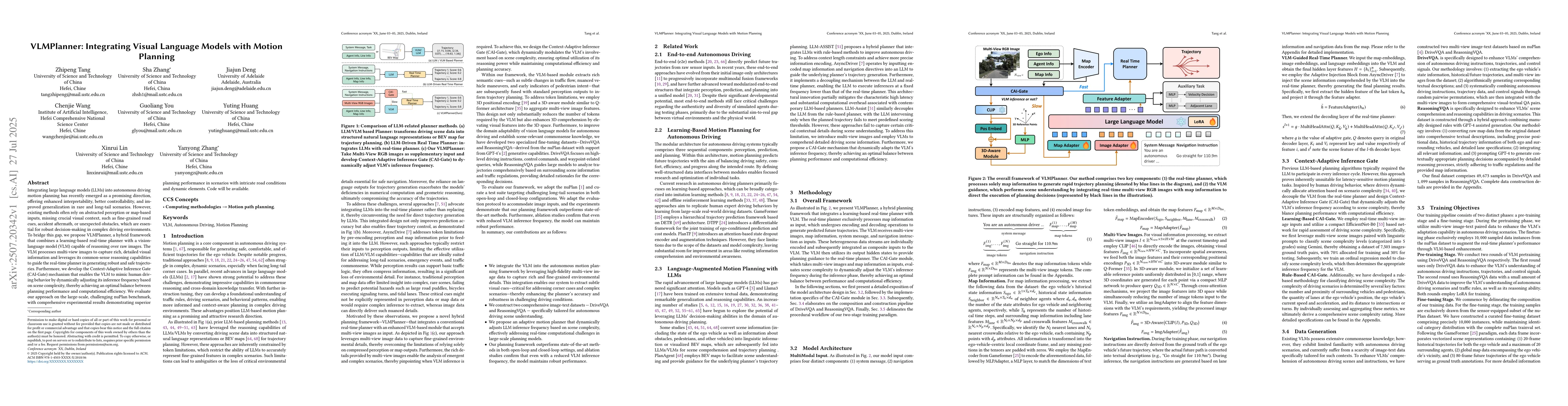 Integrating large language models (LLMs) into autonomous driving motion planning has recently emerged as a promising direction, offering enhanced interpretability, better controllability, and improved generalization in rare and long-tail scenarios. However, existing methods often rely on abstracted perception or map-based inputs, missing crucial visual context, such as fine-grained road cues, accident aftermath, or unexpected obstacles, which are essential for robust decision-making in complex driving environments. To bridge this gap, we propose VLMPlanner, a hybrid framework that combines a learning-based real-time planner with a vision-language model (VLM) capable of reasoning over raw images. The VLM processes multi-view images to capture rich, detailed visual information and leverages its common-sense reasoning capabilities to guide the real-time planner in generating robust and safe trajectories. Furthermore, we develop the Context-Adaptive Inference Gate (CAI-Gate) mechanism that enables the VLM to mimic human driving behavior by dynamically adjusting its inference frequency based on scene complexity, thereby achieving an optimal balance between planning performance and computational efficiency. We evaluate our approach on the large-scale, challenging nuPlan benchmark, with comprehensive experimental results demonstrating superior planning performance in scenarios with intricate road conditions and dynamic elements. Code will be available.