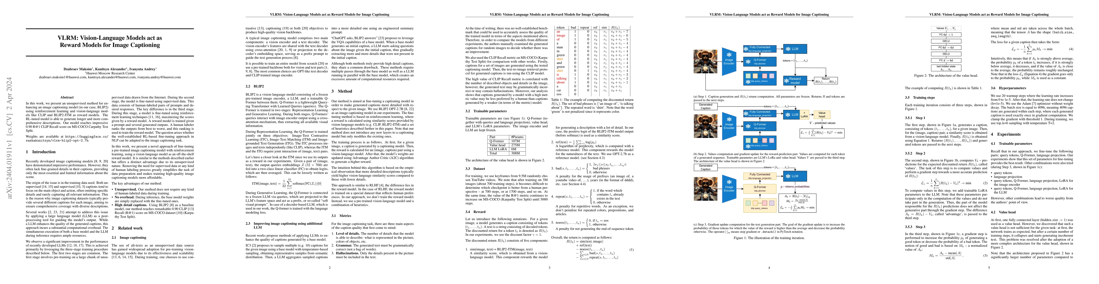 This study introduces an unsupervised method to improve image captioning models by integrating reinforcement learning and vision-language models as reward models, achieving a notable 0.90 R@1 CLIP Recall score on the MS-COCO Carpathy Test Split. The proposed VLRM method enables the generation of longer, more detailed captions.