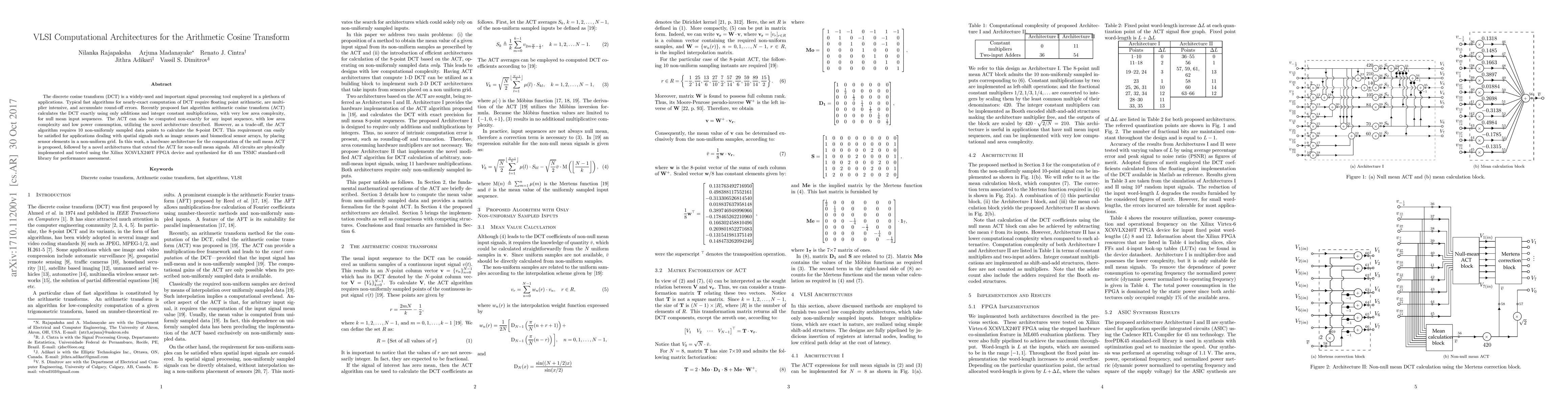 The discrete cosine transform (DCT) is a widely-used and important signal processing tool employed in a plethora of applications. Typical fast algorithms for nearly-exact computation of DCT require floating point arithmetic, are multiplier intensive, and accumulate round-off errors. Recently proposed fast algorithm arithmetic cosine transform (ACT) calculates the DCT exactly using only additions and integer constant multiplications, with very low area complexity, for null mean input sequences. The ACT can also be computed non-exactly for any input sequence, with low area complexity and low power consumption, utilizing the novel architecture described. However, as a trade-off, the ACT algorithm requires 10 non-uniformly sampled data points to calculate the 8-point DCT. This requirement can easily be satisfied for applications dealing with spatial signals such as image sensors and biomedical sensor arrays, by placing sensor elements in a non-uniform grid. In this work, a hardware architecture for the computation of the null mean ACT is proposed, followed by a novel architectures that extend the ACT for non-null mean signals. All circuits are physically implemented and tested using the Xilinx XC6VLX240T FPGA device and synthesized for 45 nm TSMC standard-cell library for performance assessment.