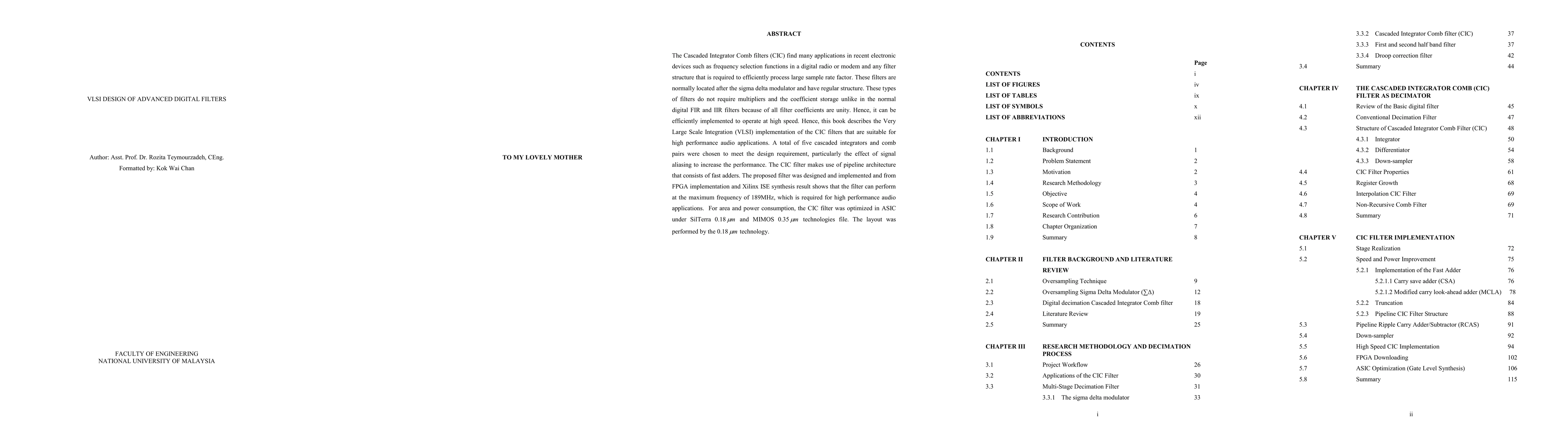 The Cascaded Integrator Comb filters (CIC) find many applications in recent electronic devices such as frequency selection functions in a digital radio or modem and any filter structure that is required to efficiently process large sample rate factor. These filters are normally located after the sigma-delta modulator and have a regular structure. These types of filters do not require multipliers and the coefficient storage unlike in the normal digital FIR and IIR filters because of all filter coefficients are unity. Hence, it can be efficiently implemented to operate at high speed. Hence, this book describes the Very Large Scale Integration (VLSI) implementation of the CIC filters that are suitable for high-performance audio applications.