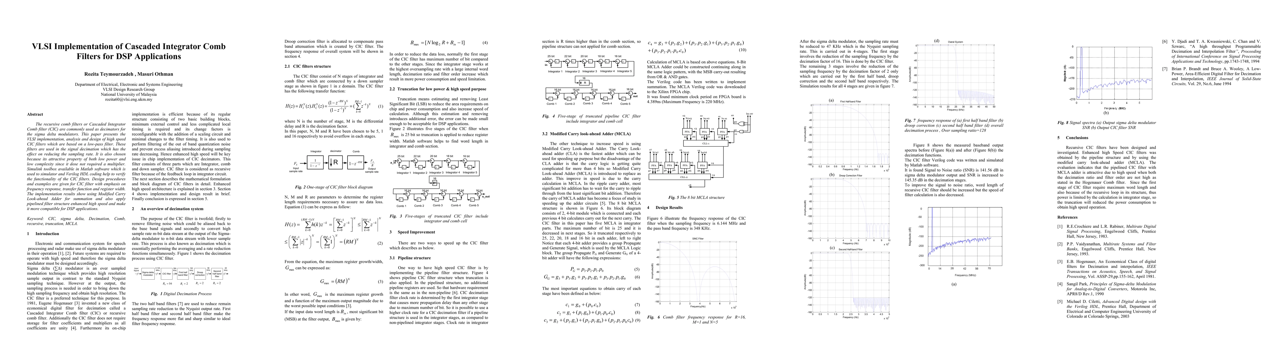 The recursive comb filters or Cascaded Integrator Comb filter (CIC) are commonly used as decimators for the sigma-delta modulators. This paper presents the VLSI implementation, analysis and design of high-speed CIC filters which are based on a low-pass filter. These filters are used in the signal decimation which has the effect on reducing the sampling rate. It is also chosen because its attractive property of both low power and low complexity since it does not require a multiplier. Simulink toolbox available in Matlab software which is used to simulator and Verilog HDL coding help to verify the functionality of the CIC filters. Design procedures and examples are given for CIC filter with emphasis on frequency response, transfer function and register width. The implementation results show using Modified Carry Look-ahead Adder for summation and also apply pipelined filter structure enhanced high speed and make it more compatible with DSP applications.
