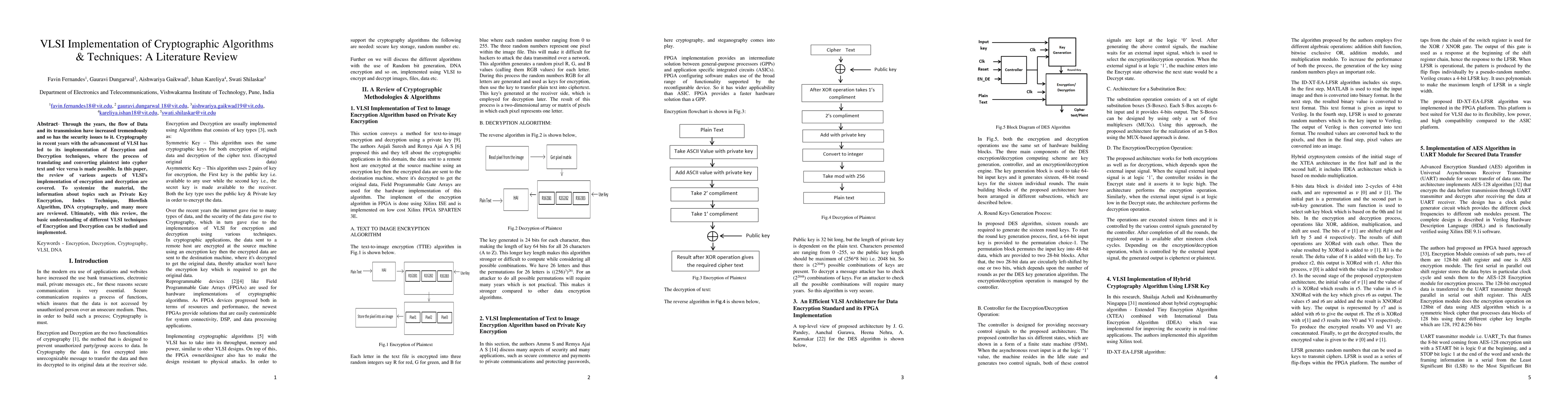 This paper reviews various VLSI implementations of cryptographic algorithms, focusing on encryption and decryption techniques. It covers aspects like Private Key Encryption, Blowfish Algorithm, and DNA cryptography, aiming to provide a foundational understanding of these VLSI-based cryptographic methods.