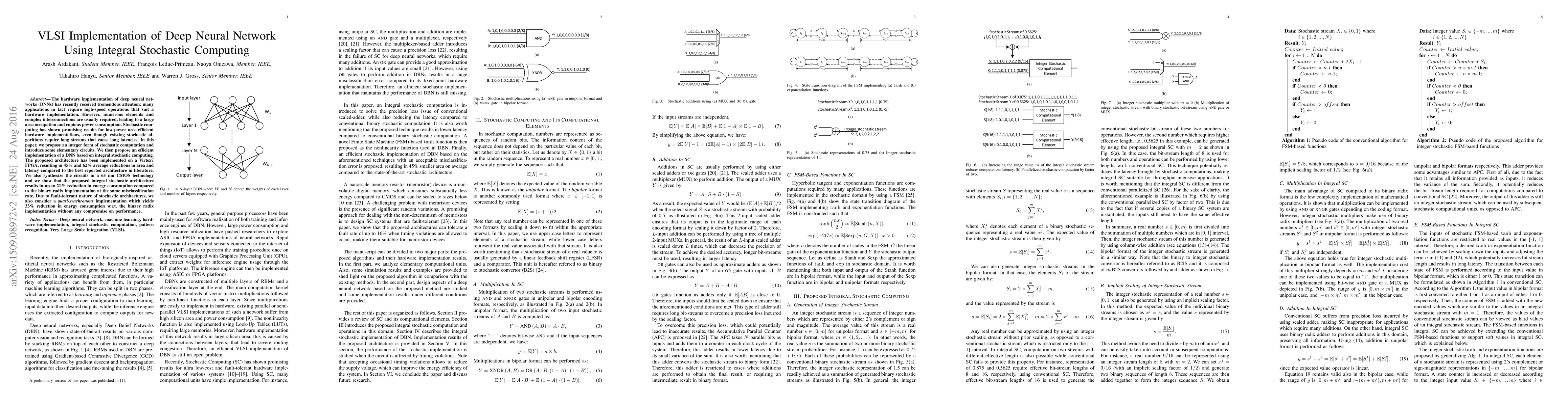 This paper proposes an efficient VLSI implementation of deep neural networks using integral stochastic computing, achieving significant reductions in area, latency, and energy consumption compared to traditional binary radix implementations. The proposed architecture demonstrates up to 45% area reduction and 62% latency reduction on an FPGA, and up to 21% energy reduction in CMOS technology.