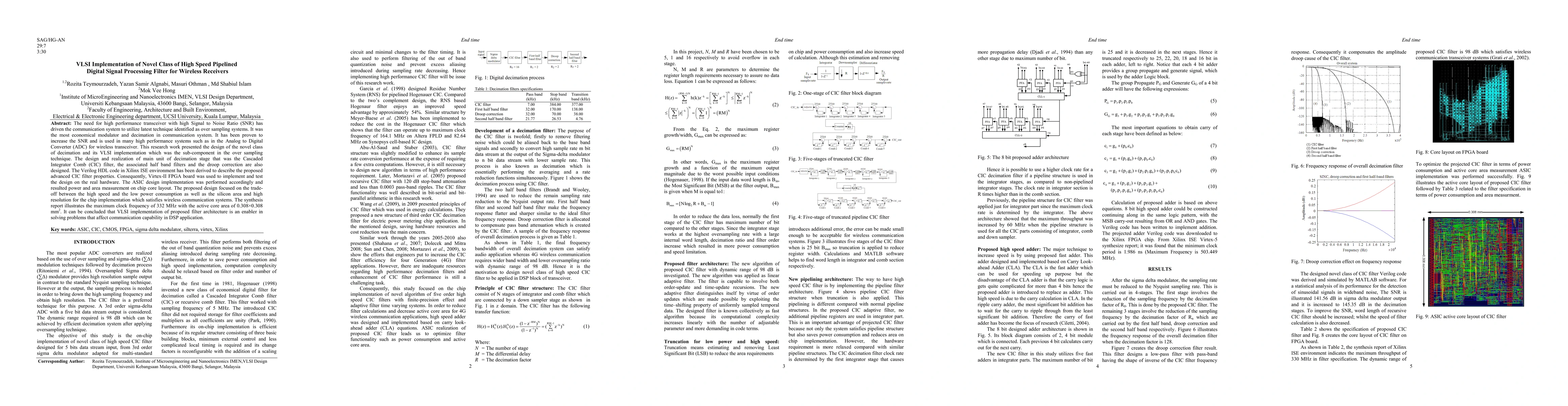 The need for a high-performance transceiver with high Signal to Noise Ratio (SNR) has driven the communication system to utilize the latest technique identified as oversampling systems. It was the most economical modulator and decimation in the communication system. It has been proven to increase the SNR and is used in many high-performance systems such as in the Analog to Digital Converter (ADC) for wireless transceiver. This research work presented the design of the novel class of decimation and it's VLSI implementation which was the sub-component in the oversampling technique. The design and realization of the main unit of decimation stage that was the Cascaded Integrator Comb (CIC) filter, the associated half-band filters, and the droop correction are also designed. The Verilog HDL code in Xilinx ISE environment has been derived to describe the proposed advanced CIC filter properties. Consequently, Virtex-II FPGA board was used to implement and test the design on the real hardware. The ASIC design implementation was performed accordingly and resulted in power and area measurement on-chip core layout. The proposed design focused on the trade-off between the high speed and the low power consumption as well as the silicon area and high resolution for the chip implementation which satisfies wireless communication systems. The synthesis report illustrates the maximum clock frequency of 332 MHz with the active core area of 0.308 x 0.308 mm2. It can be concluded that VLSI implementation of proposed filter architecture is an enabler in solving problems that affect communication capability in DSP application.