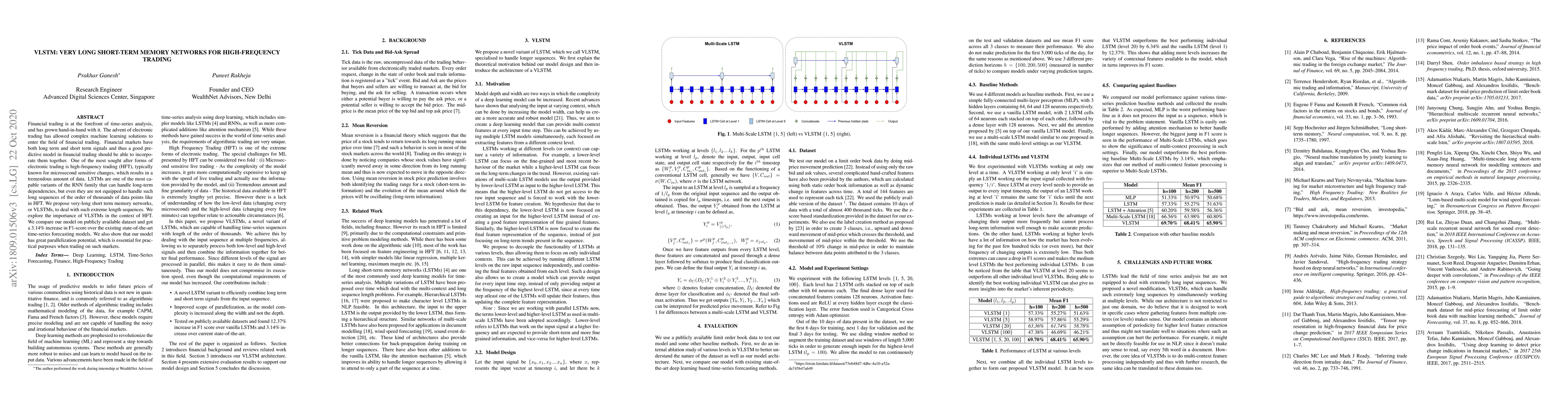 Financial trading is at the forefront of time-series analysis, and has grown hand-in-hand with it. The advent of electronic trading has allowed complex machine learning solutions to enter the field of financial trading. Financial markets have both long term and short term signals and thus a good predictive model in financial trading should be able to incorporate them together. One of the most sought after forms of electronic trading is high-frequency trading (HFT), typically known for microsecond sensitive changes, which results in a tremendous amount of data. LSTMs are one of the most capable variants of the RNN family that can handle long-term dependencies, but even they are not equipped to handle such long sequences of the order of thousands of data points like in HFT. We propose very-long short term memory networks, or VLSTMs, to deal with such extreme length sequences. We explore the importance of VLSTMs in the context of HFT. We compare our model on publicly available dataset and got a 3.14\% increase in F1-score over the existing state-of-the-art time-series forecasting models. We also show that our model has great parallelization potential, which is essential for practical purposes when trading on such markets.