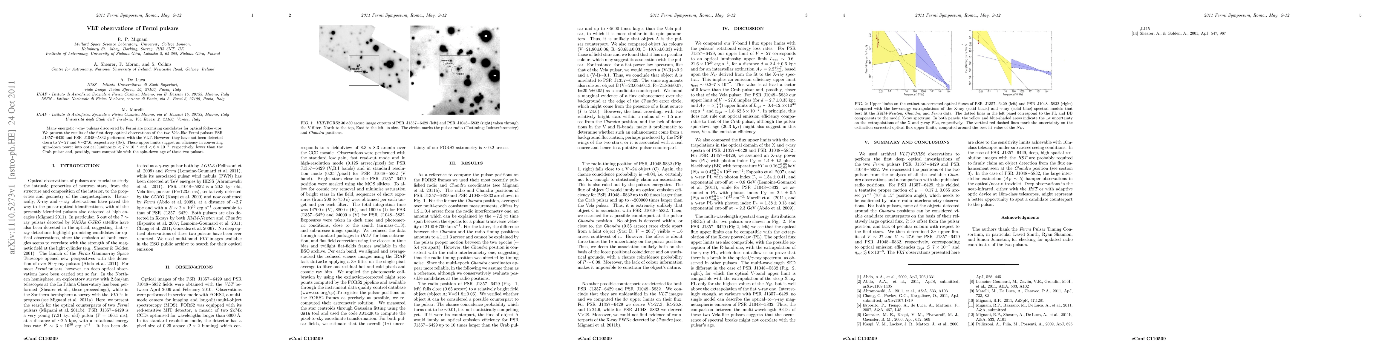 Many energetic gamma-ray pulsars discovered by Fermi are promising candidates for optical follow-ups. We present the results of the first deep optical observations of the two Vela-like Fermi pulsars PSR J1357-6429 and PSR J1048-5832 performed with the VLT. However, they have not been detected down to V~27 and V~27.6, respectively (3 sigma). These upper limits suggest an efficiency in converting spin-down power into optical luminosity < 7x10d-7 and <6x10d-6, respectively, lower than the Crab pulsar and, possibly, more compatible with the spin-down age of these two pulsars.