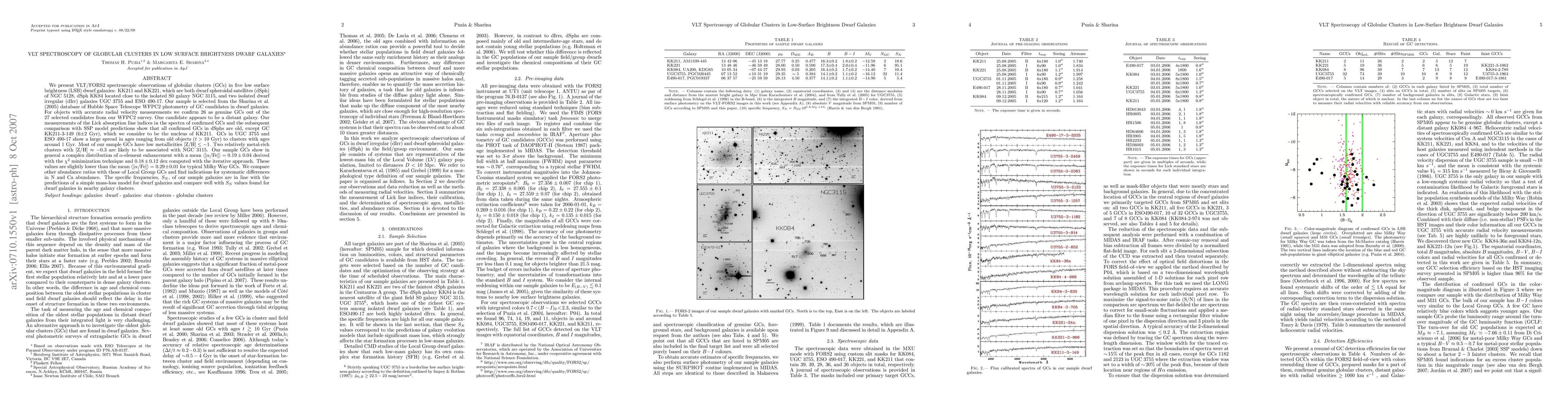 This paper presents spectroscopic observations of globular clusters in five low surface brightness dwarf galaxies using VLT/FORS2, confirming 26 genuine GCs. The confirmed GCs in dwarf spheroidals are predominantly old, while those in irregular galaxies show a range of ages. The clusters generally have low metallicities, with some metal-rich clusters likely associated with NGC 3115. The study finds complex alpha-element enhancements and systematic differences in N and Ca abundance compared to Local Group GCs.