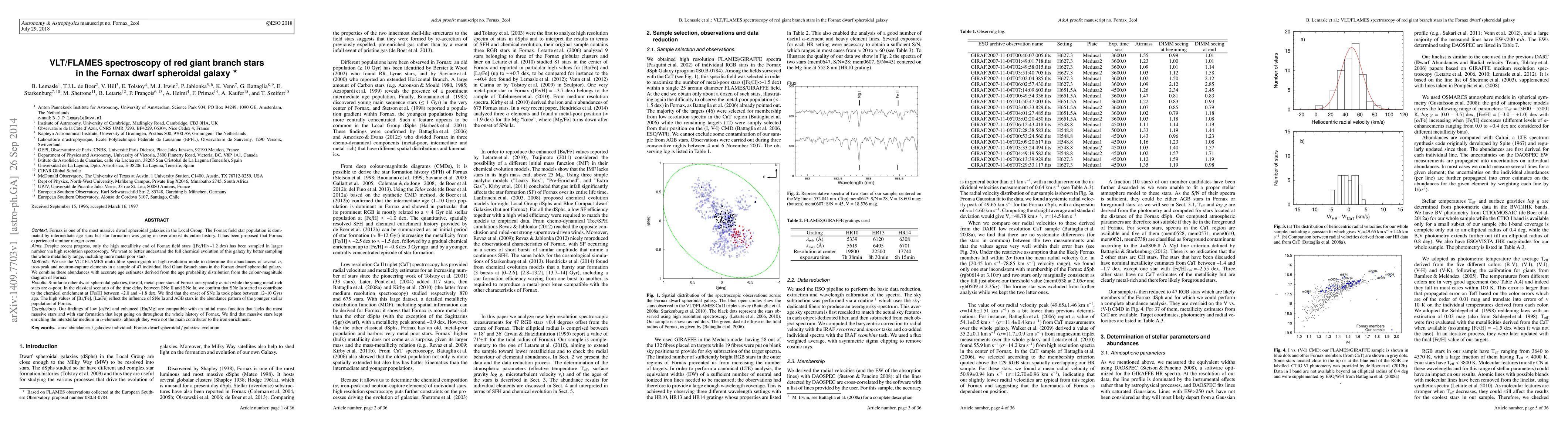 This study uses VLT/FLAMES spectroscopy to analyze 47 Red Giant Branch stars in the Fornax dwarf spheroidal galaxy, revealing a full chemical evolution spectrum. The research finds that metal-poor, old stars are alpha-rich, while metal-rich, younger stars are alpha-poor, indicating the influence of Type Ia supernovae and asymptotic giant branch stars in the younger population.