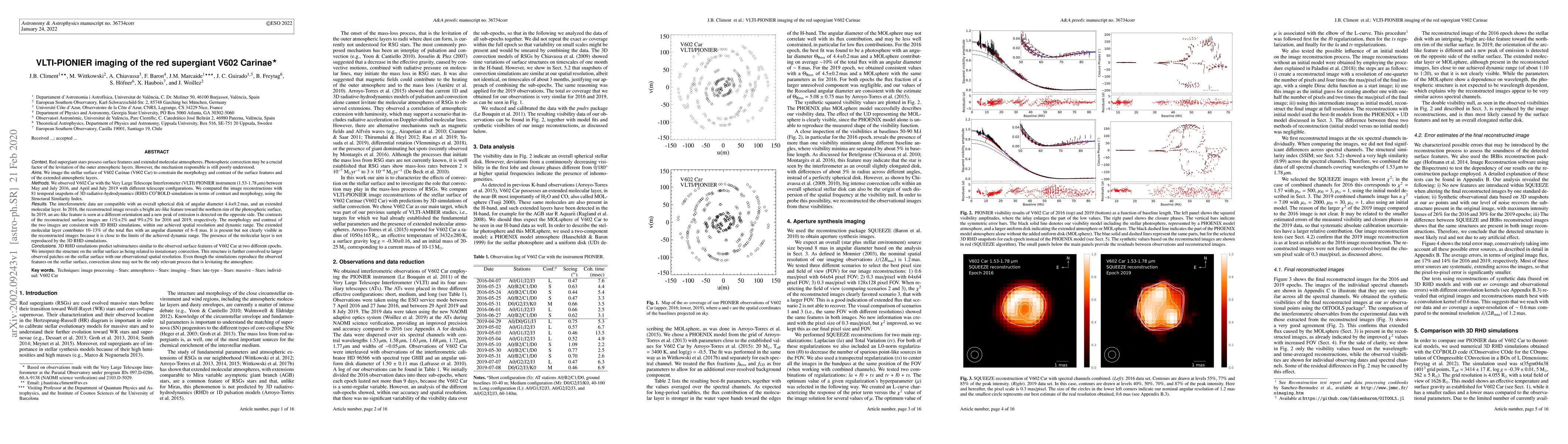 Context. Red supergiant stars possess surface features and extended molecular atmospheres. Photospheric convection may be a crucial factor of the levitation of the outer atmospheric layers. However, the mechanism responsible is still poorly understood. Aims. We image the stellar surface of V602 Carinae (V602 Car) to constrain the morphology and contrast of the surface features and of the extended atmospheric layers. Methods. We observed V602 Car with the Very Large Telescope Interferometer (VLTI) PIONIER instrument (1.53-1.78 $\mathrm{\mu}$m) between May and July 2016, and April and July 2019 with different telescope configurations. We compared the image reconstructions with 81 temporal snapshots of 3D radiative-hydrodynamics (RHD) CO$^5$BOLD simulations in terms of contrast and morphology, using the Structural Similarity Index. Results. The interferometric data are compatible with an overall spherical disk of angular diameter 4.4$\pm$0.2 mas, and an extended molecular layer. In 2016, the reconstructed image reveals a bright arc-like feature toward the northern rim of the photospheric surface. In 2019, an arc-like feature is seen at a different orientation and a new peak of emission is detected on the opposite side. The contrasts of the reconstructed surface images are 11%$\pm$2% and 9%$\pm$2% for 2016 and 2019, respectively. The morphology and contrast of the two images are consistent with 3D RHD simulations, within our achieved spatial resolution and dynamic range. The extended molecular layer contributes 10--13% of the total flux with an angular diameter of 6--8 mas. It is present but not clearly visible in the reconstructed images because it is close to the limits of the achieved dynamic range. The presence of the molecular layer is not reproduced by the 3D RHD simulations. Conclusions...