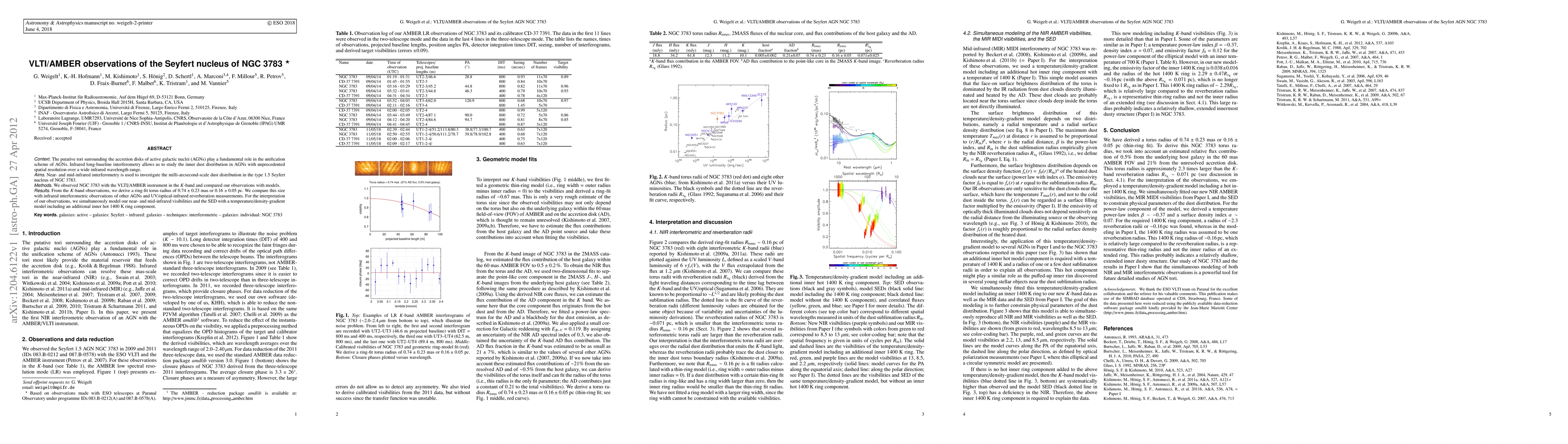 This study uses VLTI/AMBER to observe NGC 3783's Seyfert nucleus in near- and mid-infrared, revealing a torus radius of 0.16 +/- 0.05 pc. The findings are modeled with a temperature/density-gradient model, suggesting an additional inner hot ring component.