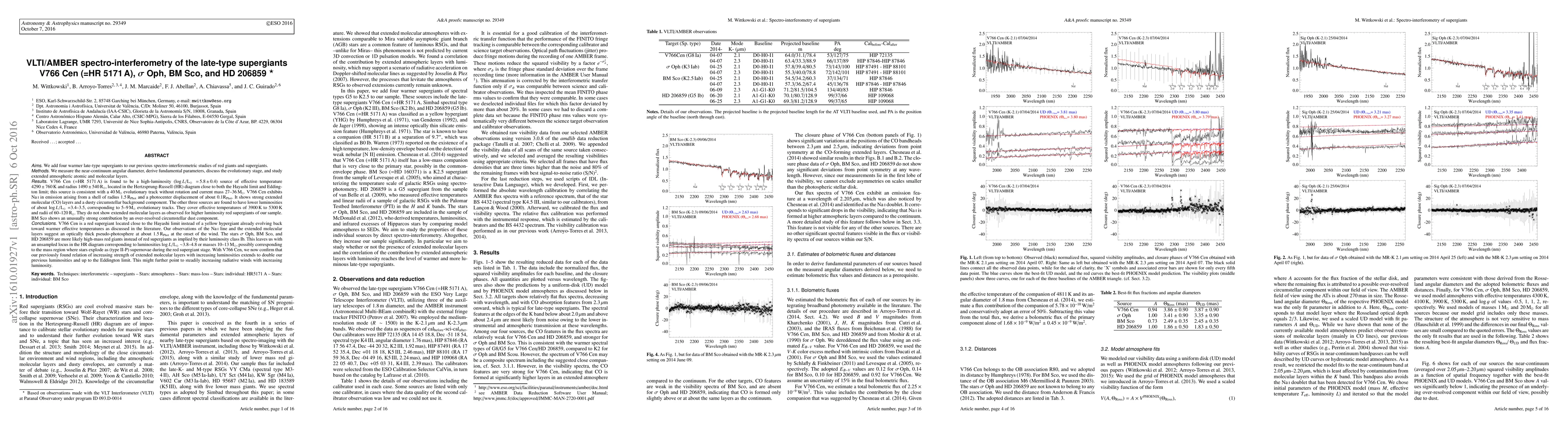 We add four warmer late-type supergiants to our previous spectro-interferometric studies of red giants and supergiants. V766 Cen (=HR 5171 A) is found to be a high-luminosity log(L/L_sun)=5.8+-0.4 source of Teff 4290+-760 K and radius 1490+-540 Rsun located close to both the Hayashi and Eddington limits; this source is consistent with a 40 Msun evolutionary track without rotation and current mass 27-36 Msun. It exhibits NaI in emission arising from a shell of radius 1.5 Rphot and a photocenter displacement of about 0.1 Rphot. V766 Cen shows strong extended molecular (CO) layers and a dusty circumstellar background component. This suggest an optically thick pseudo-photosphere at about 1.5 Rphot at the onset of the wind. V766 Cen is a red supergiant located close to the Hayashi limit instead of a yellow hypergiant already evolving back toward warmer Teff as previously discussed. The stars sigma Oph, BM Sco, and HD 206859 are found to have lower luminosities of about log(L/Lsun)=3.4-3.5 and Teff of 3900-5300 K, corresponding to 5-9 Msun tracks. They do not show extended molecular layers as observed for higher luminosity red supergiants of our sample. BM Sco shows an unusually strong contribution by an over-resolved circumstellar dust component. These stars are more likely high-mass red giants instead of red supergiants. This leaves us with an unsampled locus in the HR diagram corresponding to luminosities log(L/Lsun)~3.8-4.8 or masses 10-13 Msun, possibly corresponding to the mass region where stars explode as type II-P supernovae during the RSG stage. Our previously found relation of increasing strength of extended molecular layers with increasing luminosities is now confirmed to extend to double our previous luminosities and up to the Eddington limit. This might further point to steadily increasing radiative winds with increasing luminosity. [Abridged]