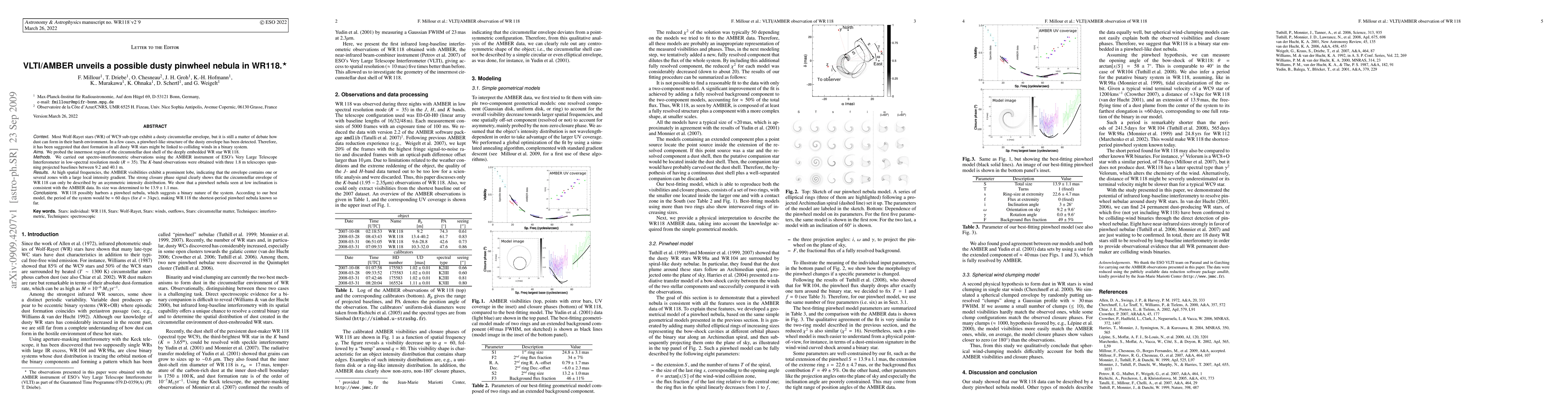 The study uses VLTI/AMBER to examine WR 118, a dusty WC9 Wolf-Rayet star. High-resolution K-band interferometric observations reveal a possible pinwheel-shaped dusty nebula, indicating a binary system with a short orbital period of ~60 days, making it one of the shortest-period pinwheel nebulae known.