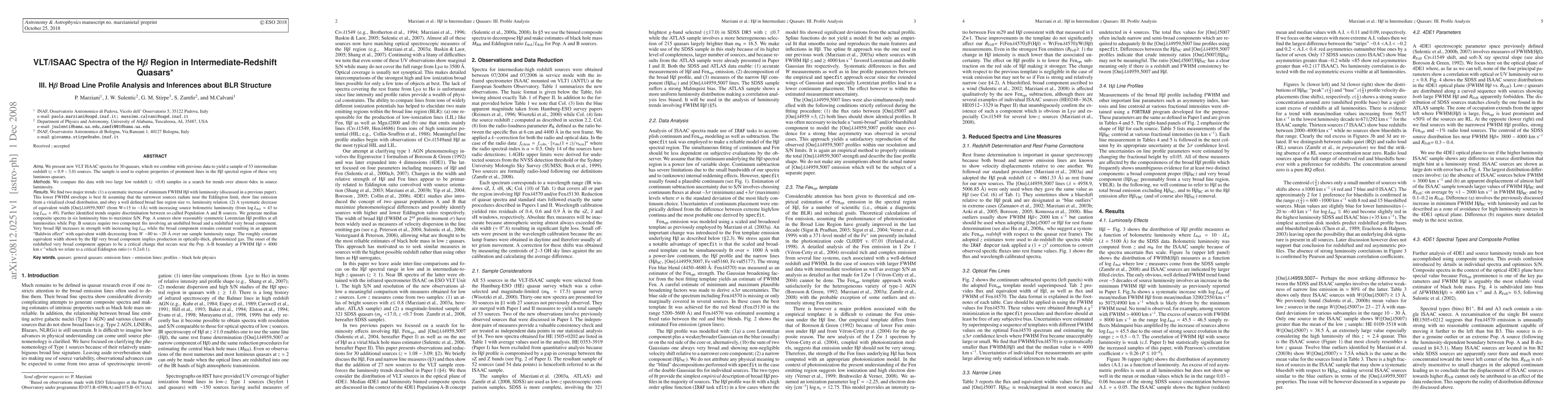 This study analyzes VLT/ISAAC spectra of 53 intermediate-redshift quasars, identifying two key trends. Firstly, a rise in Hbeta FWHM with luminosity, suggesting a virialized cloud distribution. Secondly, a decrease in [OIII] equivalent width with increasing luminosity. The research distinguishes between Population A (symmetric Hbeta profiles) and B (requiring two-component fits) sources, linking the emergence of a redshifted very broad component to a critical Eddington ratio around 0.2.