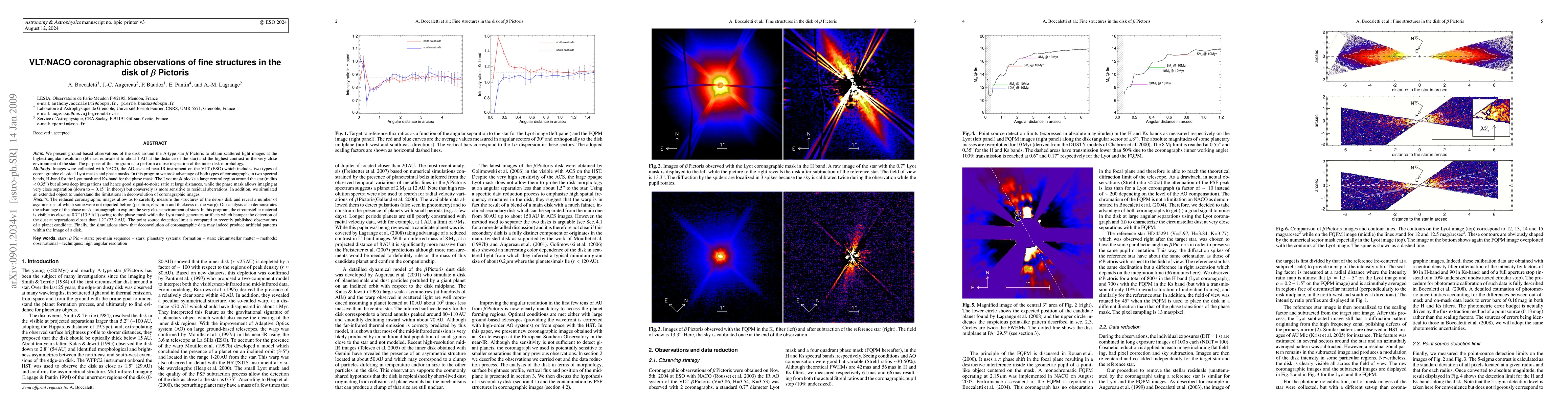 We present ground-based observations of the disk around the A-type star $\beta$ Pictoris to perform a close inspection of the inner disk morphology. Images were collected with NACO, the AO-assisted near-IR instrument on the VLT (ESO) which includes two types of coronagraphs: classical Lyot masks and phase masks. In this program we took advantage of both types of coronagraphs in two spectral bands, H-band for the Lyot mask and Ks-band for the phase mask. In addition, we simulated an extended object to understand the limitations in deconvolution of coronagraphic images. The reduced coronagraphic images allow us to carefully measure the structures of the debris disk and reveal a number of asymmetries of which some were not reported before (position, elevation and thickness of the warp). In this program, the circumstellar material is visible as close as 0.7" ($13.5 $AU) owing to the phase mask while the Lyot mask generates artifacts which hamper the detection of the dust at separations closer than 1.2" ($23.2 $AU). The point source detection limit is compared to recently published observations of a planet candidate. Finally, the simulations show that deconvolution of coronagraphic data may indeed produce artificial patterns within the image of a disk.
