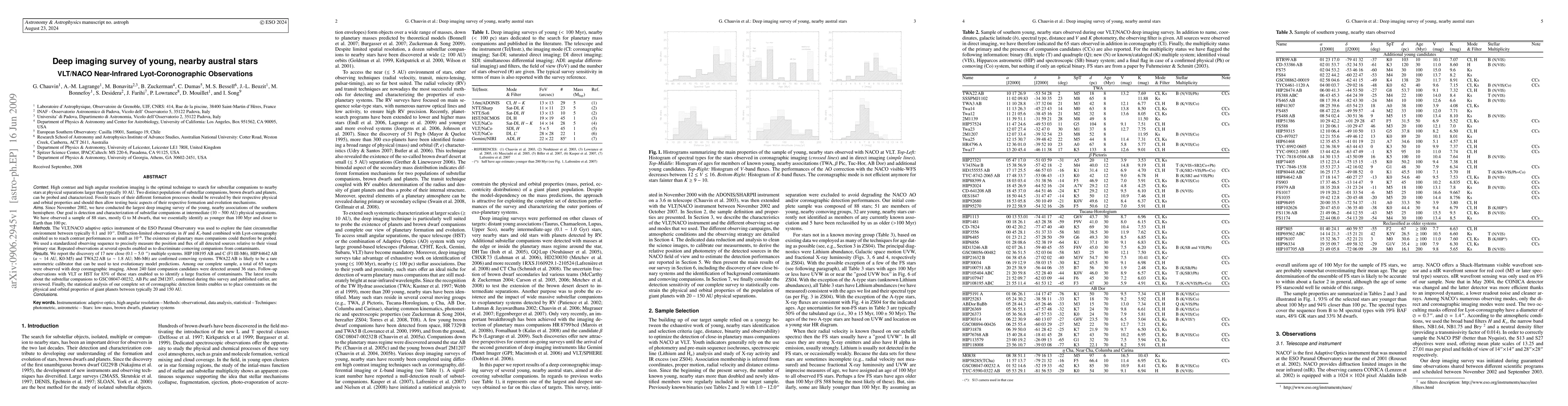 Since November 2002, we have conducted the largest deep imaging survey of the young, nearby associations of the southern hemisphere. Our goal is detection and characterization of substellar companions at intermediate (10--500 AU) physical separations. We have observed a sample of 88 stars, mostly G to M dwarfs, that we essentially identify as younger than 100 Myr and closer to Earth than 100 pc. The VLT/NACO adaptive optics instrument of the ESO Paranal Observatory was used to explore the faint circumstellar environment between typically 0.1 and 10''. We report the discovery of 17 new close (0.1-5.0'') multiple systems. HIP108195AB and C (F1III-M6), HIP84642AB (a~14 AU, K0-M5) and TWA22AB (a~1.8 AU; M6-M6) confirmed comoving systems. TWA22AB is likely to be a astrometric calibrator that can be used to test evolutionary predictions. Among our complete sample, a total of 65 targets observed with deep coronagraphic imaging. About 240 faint candidates were detected around 36 stars. Follow-up observations VLT or HST for 83% of these stars enabled us to identify a fraction of contaminants. The latest results about the substellar companions to GSC08047-00232, AB Pic and 2M1207, confirmed during this survey and published earlier, are reviewed. Finally, the statistical analysis of our complete set of coronagraphic limits enables us to place constraints on the physical and properties of giant planets between typically 20 and 150 AU.