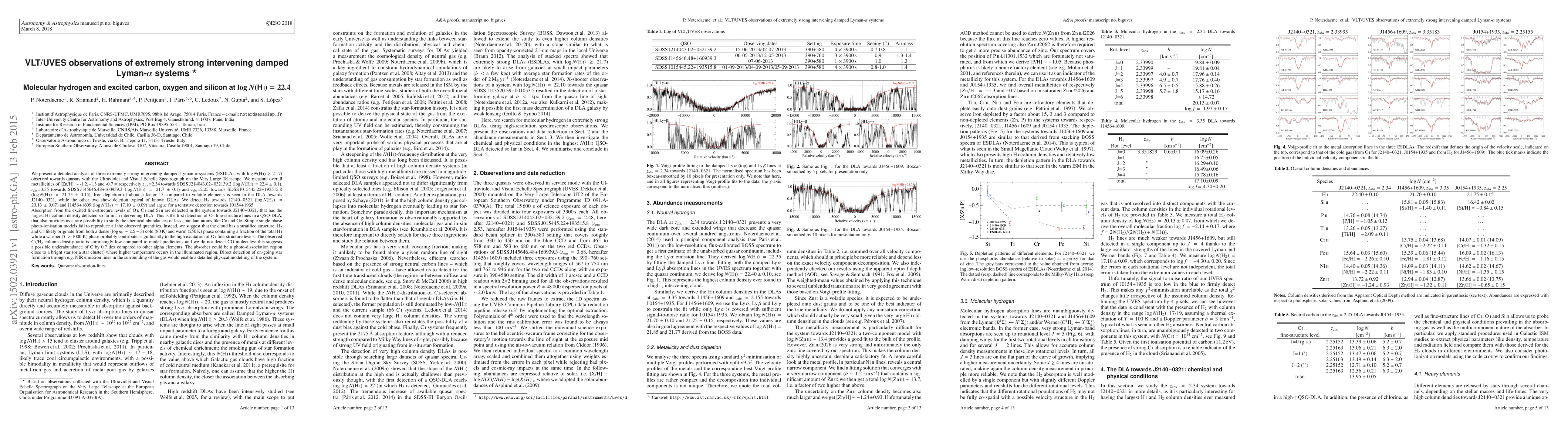 This paper analyzes three extremely strong damped Lyman-alpha systems, detecting molecular hydrogen and excited carbon, oxygen, and silicon in the system with the highest HI column density. The study suggests a stratified cloud structure and indicates a possible underabundance of carbon in the absorbing gas.