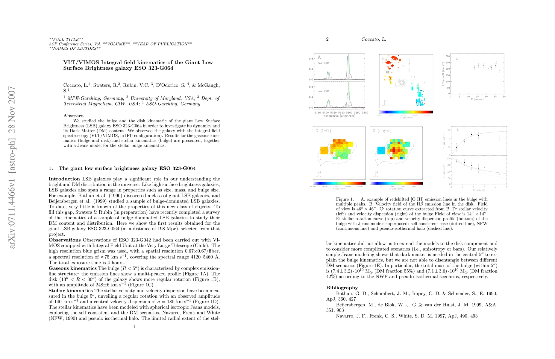 We studied the bulge and the disk kinematic of the giant Low Surface Brightness (LSB) galaxy ESO 323-G064 in order to investigate its dynamics and its Dark Matter (DM) content. We observed the galaxy with the integral field spectroscopy (VLT/VIMOS, in IFU configuration). Results for the gaseous kinematics (bulge and disk) and stellar kinematics (bulge) are presented, together with a Jeans model for the stellar bulge kinematics.