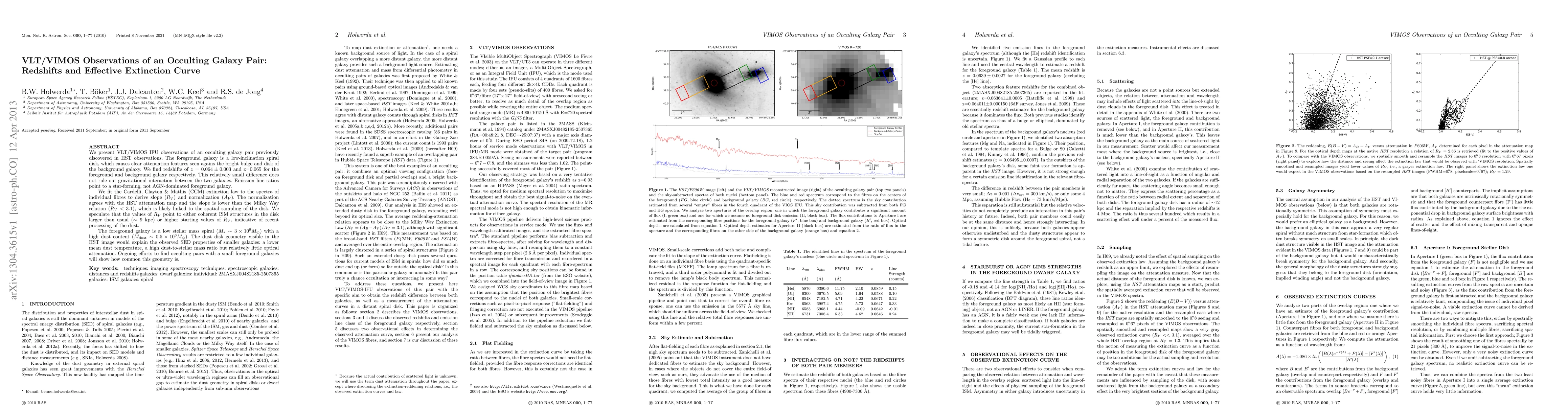 We present VLT/VIMOS IFU observations of an occulting galaxy pair previously discovered in HST observations. The foreground galaxy is a low-inclination spiral disk, which causes clear attenuation features seen against the bright bulge and disk of the background galaxy. We find redshifts of $z=0.064 \pm0.003$ and z=0.065 for the foreground and background galaxy respectively. This relatively small difference does not rule out gravitational interaction between the two galaxies. Emission line ratios point to a star-forming, not AGN-dominated foreground galaxy. We fit the Cardelli, Clayton & Mathis (CCM) extinction law to the spectra of individual fibres to derive slope ($R_V$) and normalization ($A_V$). The normalization agrees with the HST attenuation map and the slope is lower than the Milky Way relation ($R_V<3.1$), which is likely linked to the spatial sampling of the disk. We speculate that the values of $R_V$ point to either coherent ISM structures in the disk larger than usual ($\sim9$ kpc) or higher starting values of $R_V$, indicative of recent processing of the dust. The foreground galaxy is a low stellar mass spiral ($M_* \sim 3 \times 10^9 M_\odot$) with a high dust content ($M_{\rm dust} \sim 0.5 \times 10^6 M_\odot$). The dust disk geometry visible in the HST image would explain the observed SED properties of smaller galaxies: a lower mean dust temperature, a high dust-to-stellar mass ratio but relatively little optical attenuation. Ongoing efforts to find occulting pairs with a small foreground galaxies will show how common this geometry is.