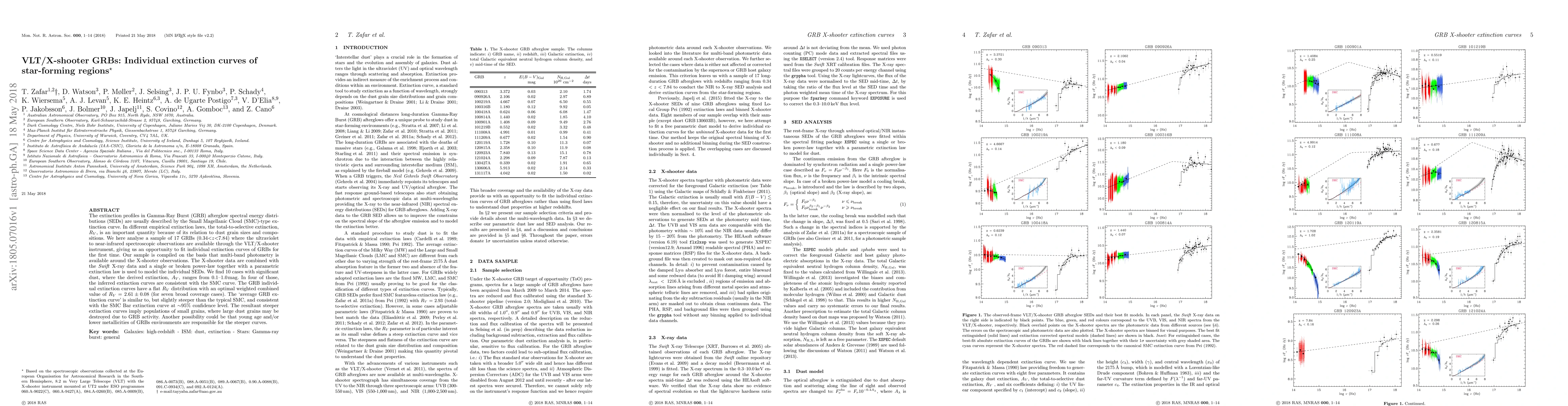 This study analyzes the extinction profiles of 17 Gamma-Ray Bursts (GRBs) using VLT/X-shooter data to fit individual extinction curves for the first time. The derived extinction curves suggest a population of small grains, potentially due to GRB activity or the young, low-metallicity environments of GRBs.