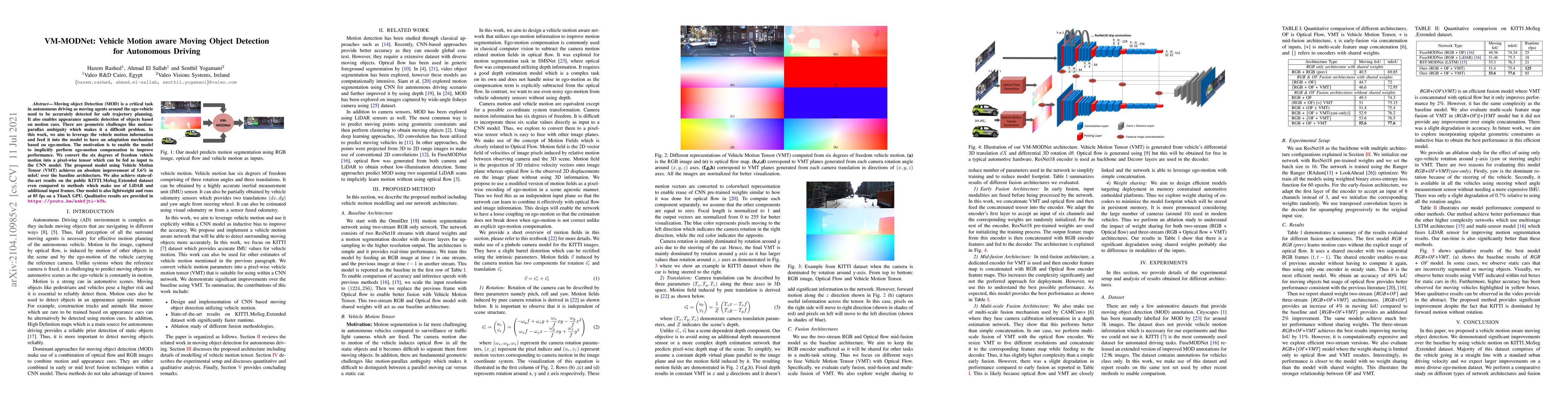 VM-MODNet leverages vehicle motion information to enhance moving object detection in autonomous driving, achieving a 5.6% improvement in mIoU over the baseline. The model uses a Vehicle Motion Tensor to compensate for ego-motion, achieving state-of-the-art results on the KITTI_MoSeg_Extended dataset while remaining lightweight and fast.