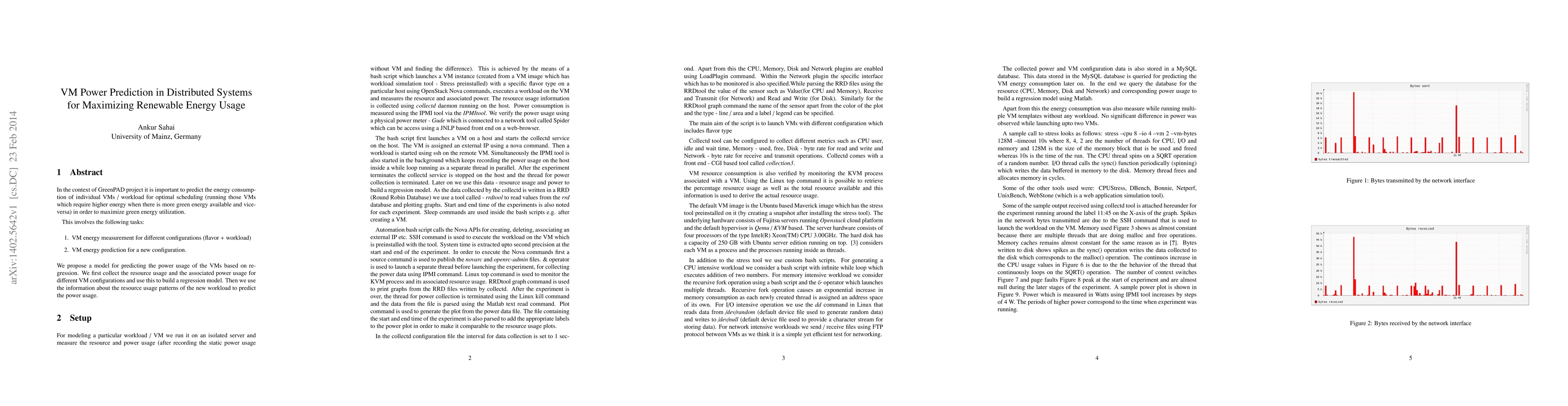 In the context of GreenPAD project it is important to predict the energy consumption of individual (and mixture of) VMs / workload for optimal scheduling (running those VMs which require higher energy when there is more green energy available and vice-versa) in order to maximize green energy utilization. For this we execute the following experiments on an Openstack cloud testbed consisting of Fujitsu servers: VM energy measurement for different configurations (flavor + workload) and VM energy prediction for a new configuration. The automation framework for running these experiments uses bash scripts which call tools like 'stress' (simulating workloads), 'collected' (resource usage) and 'IPMI' (power measurement). We propose a linear model for predicting the power usage of the VMs based on regression. We first collect the resource usage (using collected) and the associated power usage (using IPMI) for different VM configurations and use this to build a (multi-) regression model (between resource usage and VM energy consumption). Then we use the information about the resource usage patterns of the new workload to predict the power usage. For predicting power for mix of workloads we execute (build a regression model based on) experiments with random workloads. We observe the highest energy usage for CPU-intensive workloads followed by memory-intensive workloads.