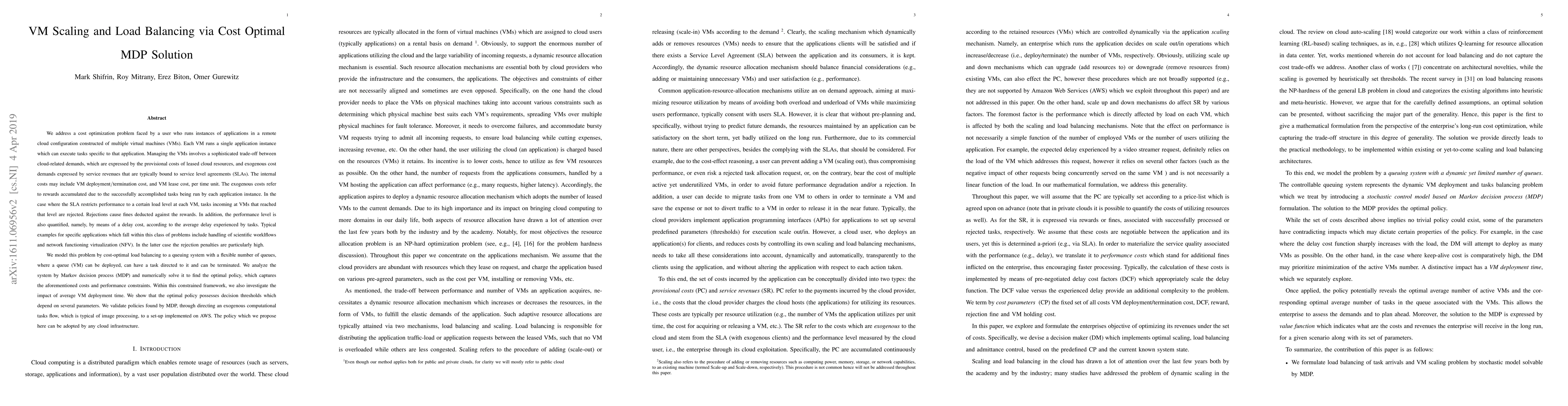 This paper proposes a cost-optimal load balancing strategy for managing virtual machines (VMs) in a cloud environment using Markov decision processes (MDPs). It aims to optimize the trade-off between cloud resource costs and service rewards while adhering to performance constraints and SLAs. The study validates the proposed MDP-based policy through an implementation on AWS.