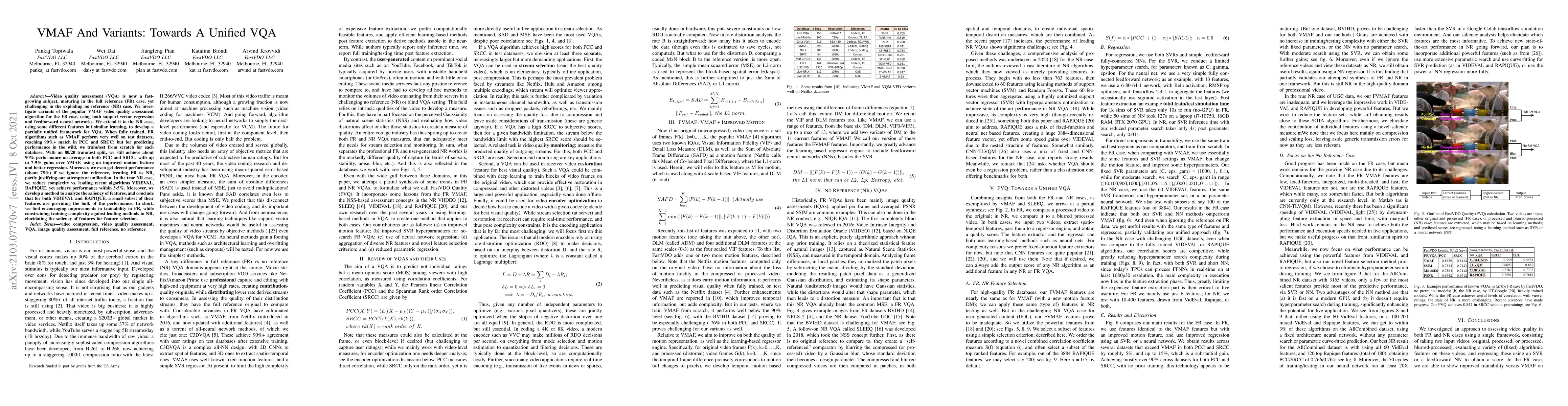 Video quality assessment (VQA) is now a fast-growing subject, maturing in the full reference (FR) case, yet challenging in the exploding no reference (NR) case. We investigate variants of the popular VMAF video quality assessment algorithm for the FR case, using both support vector regression and feedforward neural networks. We extend it to the NR case, using some different features but similar learning, to develop a partially unified framework for VQA. When fully trained, FR algorithms such as VMAF perform very well on test datasets, reaching 90%+ match in PCC and SRCC; but for predicting performance in the wild, we train/test from scratch for each database. With an 80/20 train/test split, we still achieve about 90% performance on average in both PCC and SRCC, with up to 7-9% gains over VMAF, using an improved motion feature and better regression. Moreover, we even get decent performance (about 75%) if we ignore the reference, treating FR as NR, partly justifying our attempts at unification. In the true NR case, we reduce complexity vs. leading recent algorithms VIDEVAL, RAPIQUE, yet achieve performance within 3-5%. Moreover, we develop a method to analyze the saliency of features, and conclude that for both VIDEVAL and RAPIQUE, a small subset of their features are providing the bulk of the performance. In short, we find encouraging improvements in trainability in FR, while constraining training complexity against leading methods in NR, elucidating the saliency of features for feature selection.