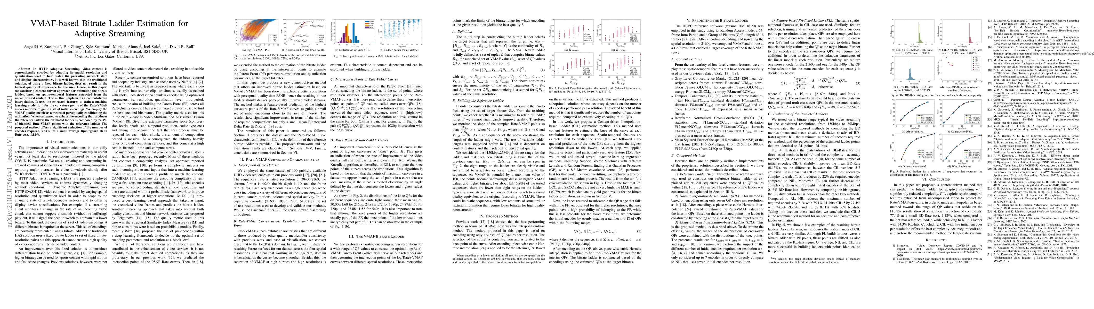 This paper proposes a VMAF-based method for estimating a bitrate ladder for adaptive streaming, aiming to improve user experience quality. It uses machine learning to infer optimal bitrate points based on content features, significantly reducing the number of encodings by 77.4% while maintaining a small perceptual quality loss.
