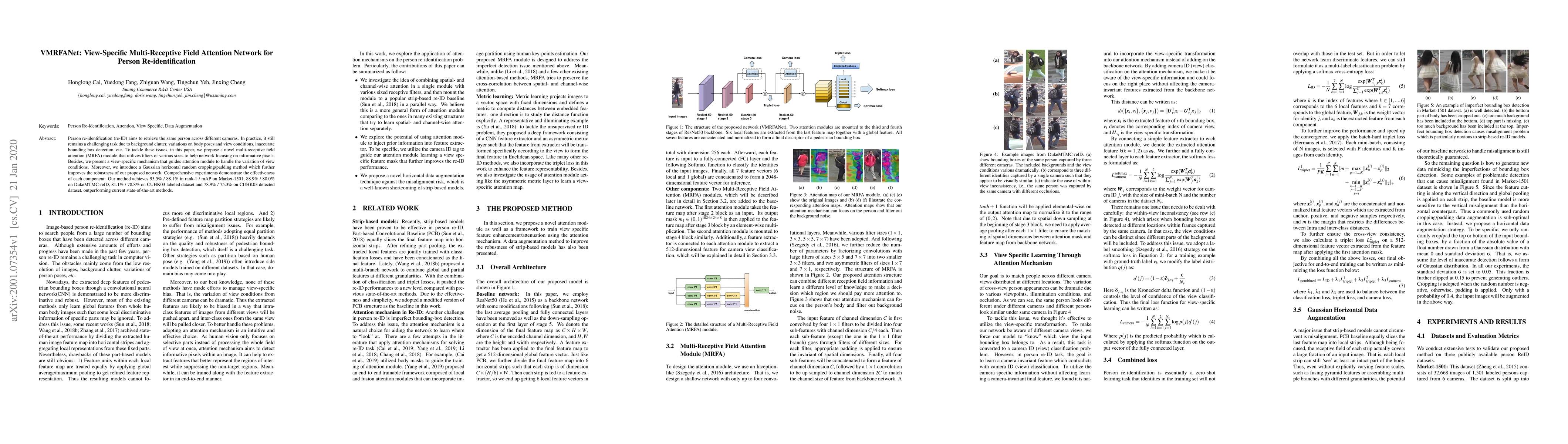 Person re-identification (re-ID) aims to retrieve the same person across different cameras. In practice, it still remains a challenging task due to background clutter, variations on body poses and view conditions, inaccurate bounding box detection, etc. To tackle these issues, in this paper, we propose a novel multi-receptive field attention (MRFA) module that utilizes filters of various sizes to help network focusing on informative pixels. Besides, we present a view-specific mechanism that guides attention module to handle the variation of view conditions. Moreover, we introduce a Gaussian horizontal random cropping/padding method which further improves the robustness of our proposed network. Comprehensive experiments demonstrate the effectiveness of each component. Our method achieves 95.5% / 88.1% in rank-1 / mAP on Market-1501, 88.9% / 80.0% on DukeMTMC-reID, 81.1% / 78.8% on CUHK03 labeled dataset and 78.9% / 75.3% on CUHK03 detected dataset, outperforming current state-of-the-art methods.