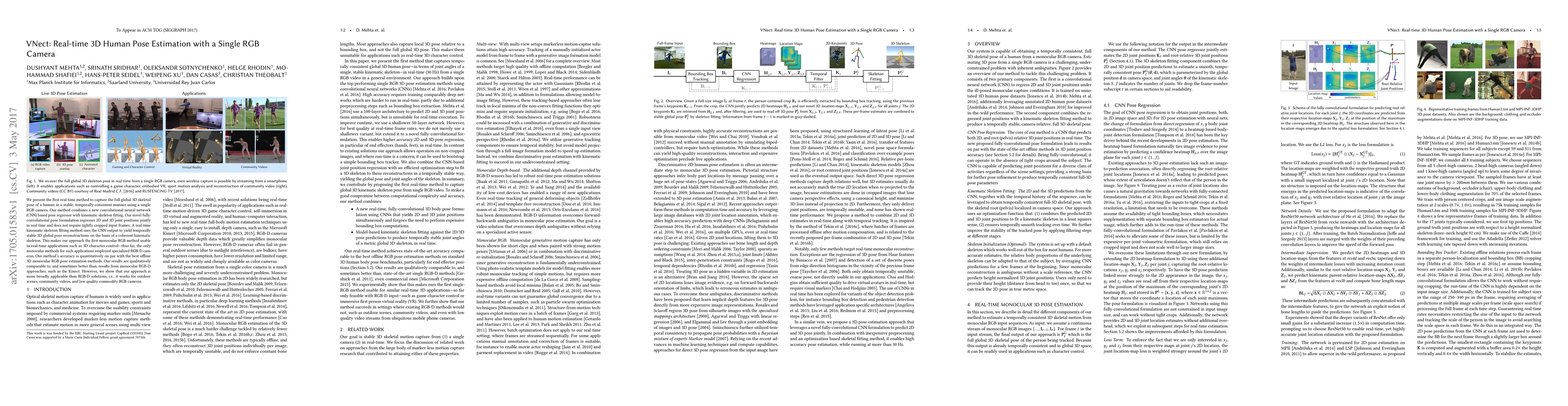 VNect presents a real-time 3D human pose estimation method using a single RGB camera, combining CNN-based pose regression with kinematic skeleton fitting for stable, temporally consistent 3D pose reconstructions, achieving accuracy comparable to RGB-D methods while being broadly applicable to various environments.