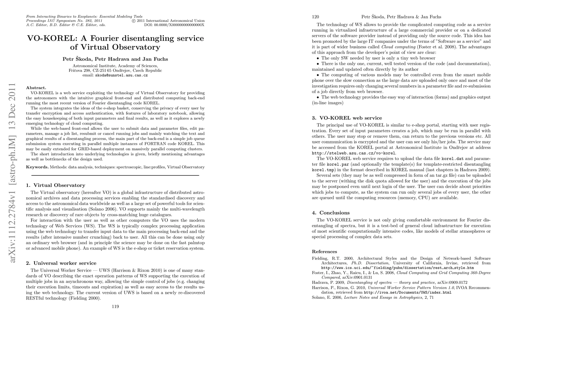 VO-KOREL is a web service exploiting the technology of Virtual Observatory for providing the astronomers with the intuitive graphical front-end and distributed computing back-end running the most recent version of Fourier disentangling code KOREL. The system integrates the ideas of the e-shop basket, conserving the privacy of every user by transfer encryption and access authentication, with features of laboratory notebook, allowing the easy housekeeping of both input parameters and final results, as well as it explores a newly emerging technology of cloud computing. While the web-based front-end allows the user to submit data and parameter files, edit parameters, manage a job list, resubmit or cancel running jobs and mainly watching the text and graphical results of a disentangling process, the main part of the back-end is a simple job queue submission system executing in parallel multiple instances of FORTRAN code KOREL. This may be easily extended for GRID-based deployment on massively parallel computing clusters. The short introduction into underlying technologies is given, briefly mentioning advantages as well as bottlenecks of the design used.