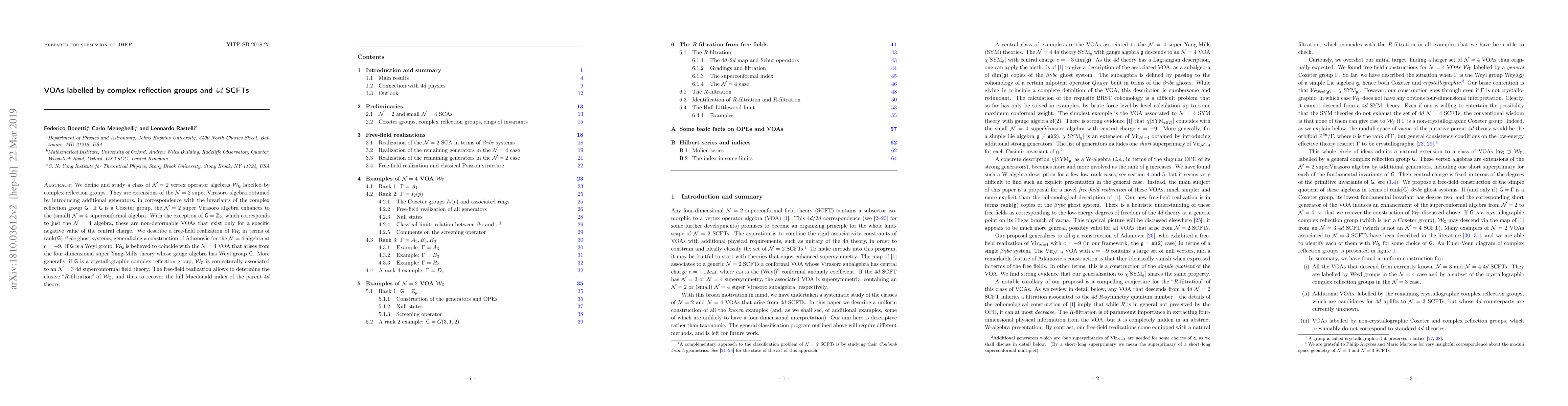 We define and study a class of $\mathcal{N}=2$ vertex operator algebras $\mathcal{W}_{\mathcal{\mathsf{G}}}$ labelled by complex reflection groups. They are extensions of the $\mathcal{N}=2$ super Virasoro algebra obtained by introducing additional generators, in correspondence with the invariants of the complex reflection group $\mathcal{\mathsf{G}}$. If $\mathcal{\mathsf{G}}$ is a Coxeter group, the $\mathcal{N}=2$ super Virasoro algebra enhances to the (small) $\mathcal{N}=4$ superconformal algebra. With the exception of $\mathcal{\mathsf{G}} = \mathbb{Z}_2$, which corresponds to just the $\mathcal{N}=4$ algebra, these are non-deformable VOAs that exist only for a specific negative value of the central charge. We describe a free-field realization of $\mathcal{W}_{\mathcal{\mathsf{G}}}$ in terms of rank$(\mathcal{\mathsf{G}})$ $\beta \gamma bc$ ghost systems, generalizing a construction of Adamovic for the $\mathcal{N}=4$ algebra at $c = -9$. If $\mathcal{\mathsf{G}}$ is a Weyl group, $\mathcal{W}_{\mathcal{\mathsf{G}}}$ is believed to coincide with the $\mathcal{N}=4$ VOA that arises from the four-dimensional super Yang-Mills theory whose gauge algebra has Weyl group $\mathcal{\mathsf{G}}$. More generally, if $\mathcal{\mathsf{G}}$ is a crystallographic complex reflection group, $\mathcal{W}_{\mathcal{\mathsf{G}}}$ is conjecturally associated to an $\mathcal{N}=3$ $4d$ superconformal field theory. The free-field realization allows to determine the elusive `$R$-filtration' of $\mathcal{W}_{\mathcal{\mathsf{G}}}$, and thus to recover the full Macdonald index of the parent $4d$ theory