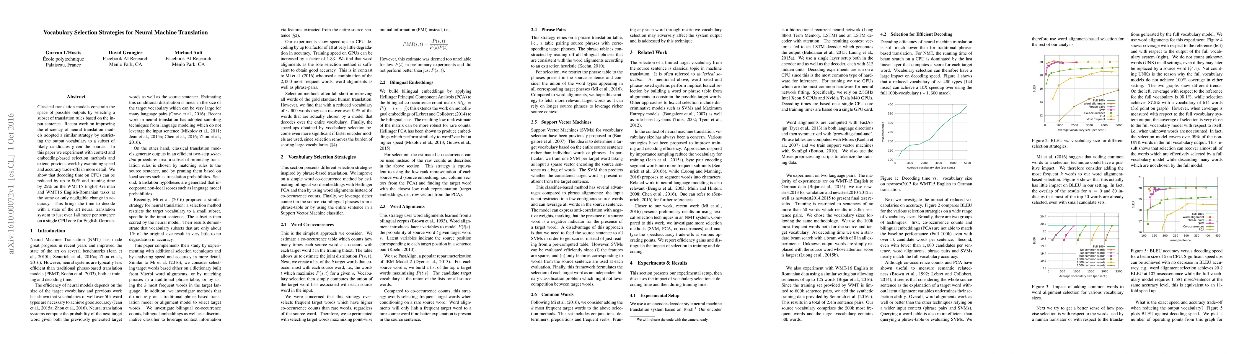 Classical translation models constrain the space of possible outputs by selecting a subset of translation rules based on the input sentence. Recent work on improving the efficiency of neural translation models adopted a similar strategy by restricting the output vocabulary to a subset of likely candidates given the source. In this paper we experiment with context and embedding-based selection methods and extend previous work by examining speed and accuracy trade-offs in more detail. We show that decoding time on CPUs can be reduced by up to 90% and training time by 25% on the WMT15 English-German and WMT16 English-Romanian tasks at the same or only negligible change in accuracy. This brings the time to decode with a state of the art neural translation system to just over 140 msec per sentence on a single CPU core for English-German.