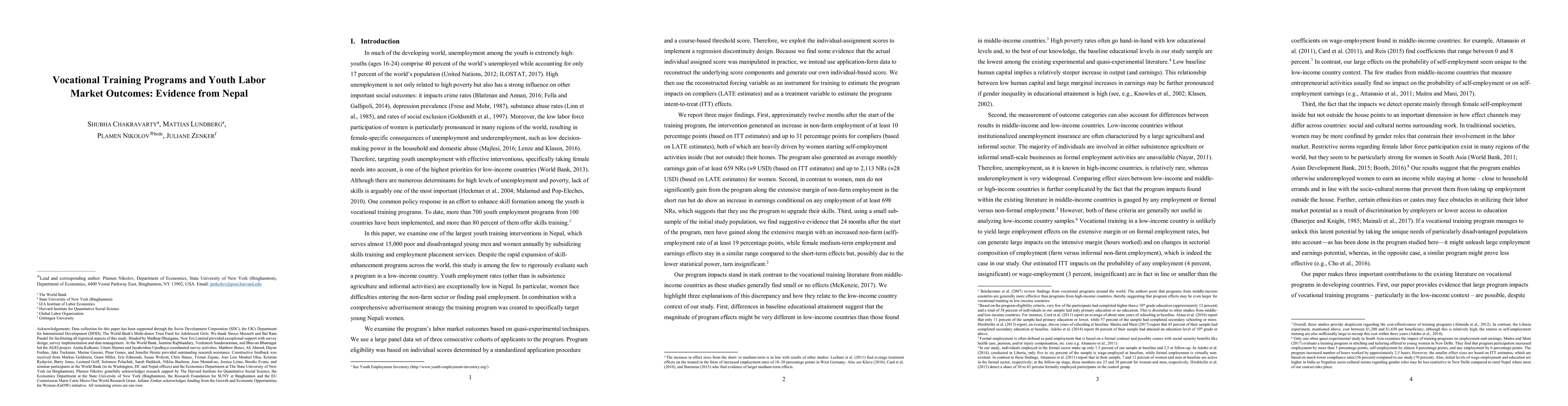 This study evaluates a vocational training program in Nepal, finding it significantly increases non-farm employment and earnings, particularly among women who start home-based self-employment. The program's success is attributed to the low baseline employment and cultural norms favoring women's home-based work.