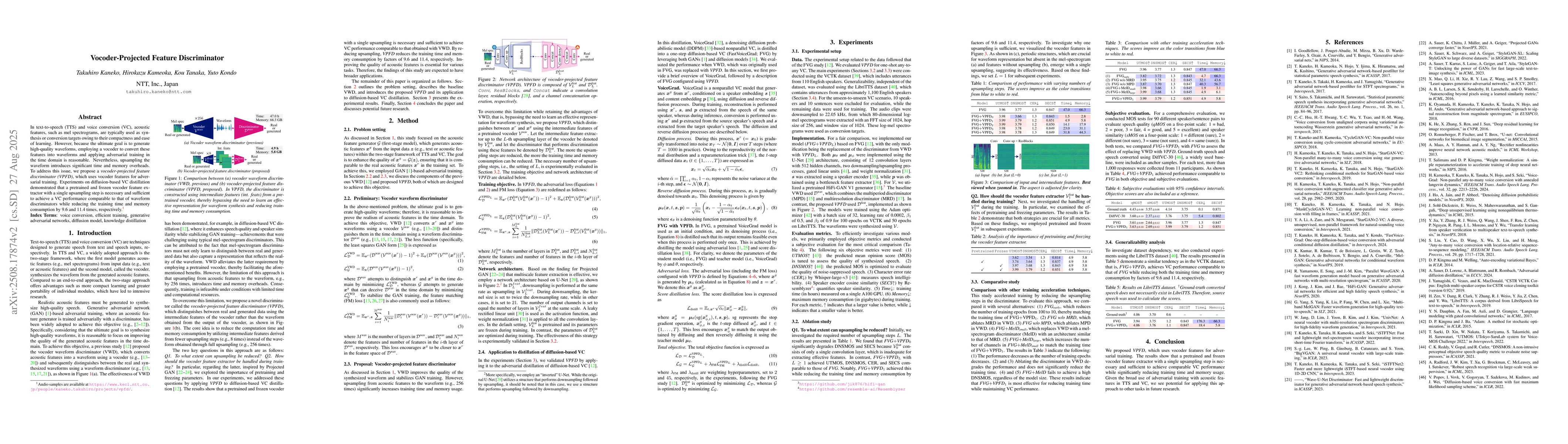 In text-to-speech (TTS) and voice conversion (VC), acoustic features, such as mel spectrograms, are typically used as synthesis or conversion targets owing to their compactness and ease of learning. However, because the ultimate goal is to generate high-quality waveforms, employing a vocoder to convert these features into waveforms and applying adversarial training in the time domain is reasonable. Nevertheless, upsampling the waveform introduces significant time and memory overheads. To address this issue, we propose a vocoder-projected feature discriminator (VPFD), which uses vocoder features for adversarial training. Experiments on diffusion-based VC distillation demonstrated that a pretrained and frozen vocoder feature extractor with a single upsampling step is necessary and sufficient to achieve a VC performance comparable to that of waveform discriminators while reducing the training time and memory consumption by 9.6 and 11.4 times, respectively.
