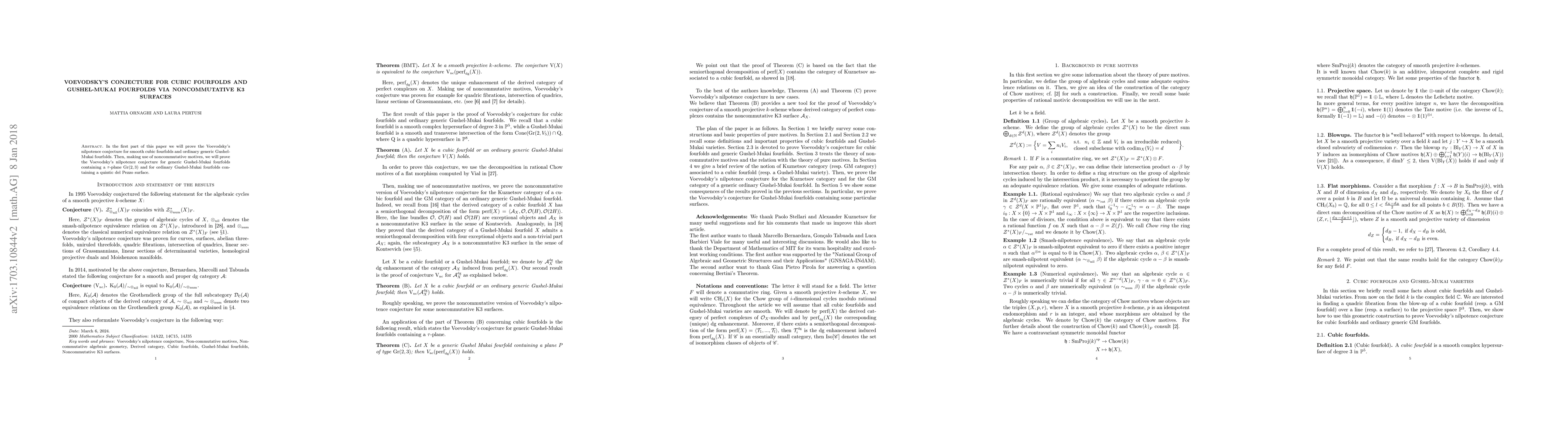 In the first part of this paper we will prove the Voevodsky's nilpotence conjecture for smooth cubic fourfolds and ordinary generic Gushel-Mukai fourfolds. Then, making use of noncommutative motives, we will prove the Voevodsky's nilpotence conjecture for generic Gushel-Mukai fourfolds containing a $\tau$-plane $\G(2,3)$ and for ordinary Gushel-Mukai fourfolds containing a quintic del Pezzo surface.