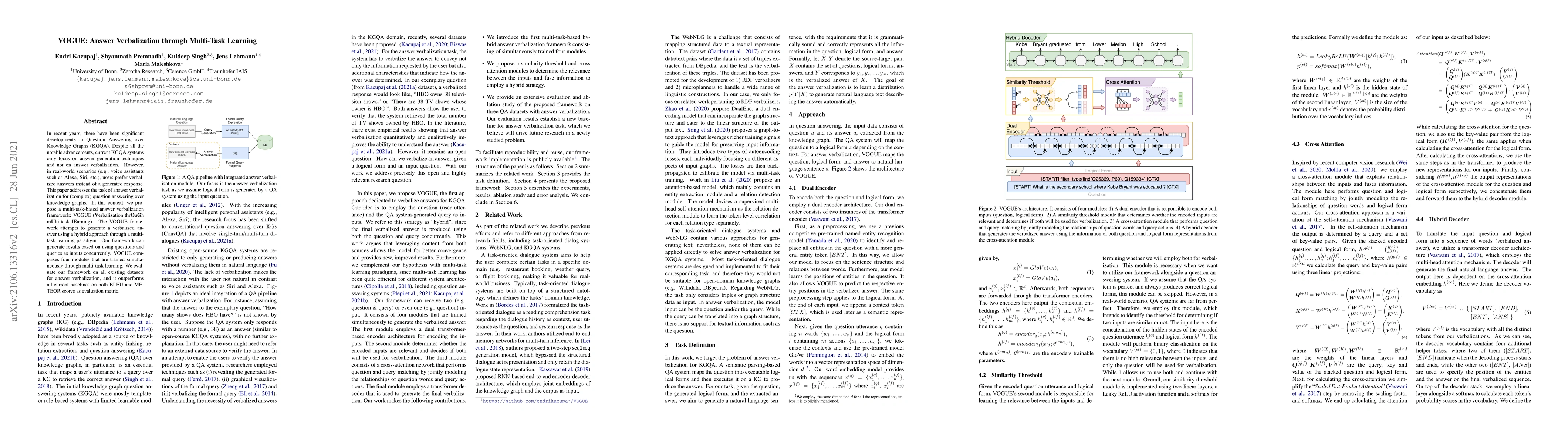 This paper proposes a multi-task learning framework called VOGUE to generate verbalized answers for complex question answering over knowledge graphs, outperforming existing baselines on BLEU and METEOR scores.