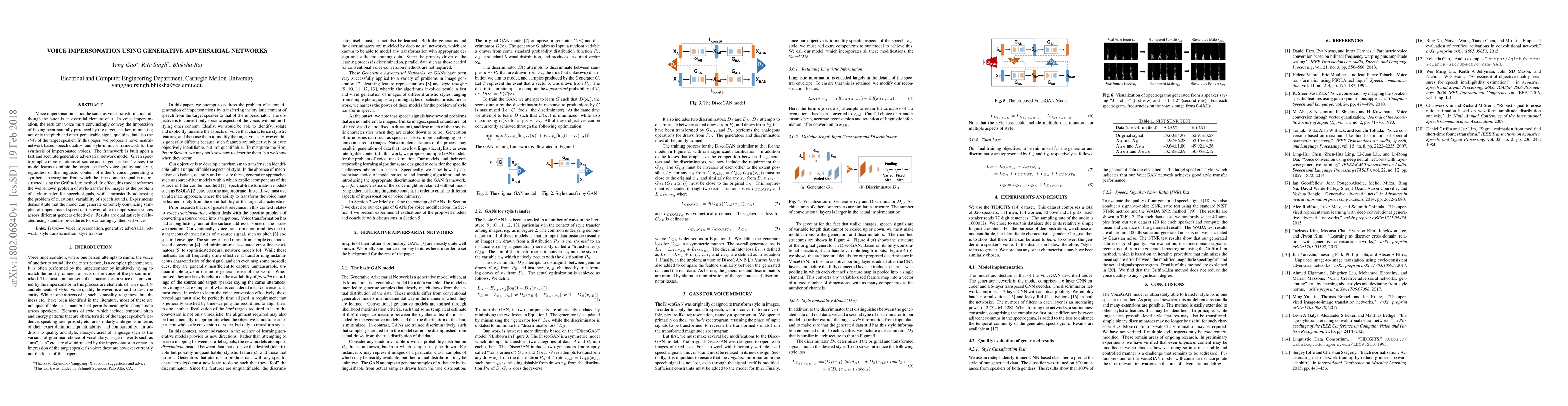 Voice impersonation is not the same as voice transformation, although the latter is an essential element of it. In voice impersonation, the resultant voice must convincingly convey the impression of having been naturally produced by the target speaker, mimicking not only the pitch and other perceivable signal qualities, but also the style of the target speaker. In this paper, we propose a novel neural network based speech quality- and style- mimicry framework for the synthesis of impersonated voices. The framework is built upon a fast and accurate generative adversarial network model. Given spectrographic representations of source and target speakers' voices, the model learns to mimic the target speaker's voice quality and style, regardless of the linguistic content of either's voice, generating a synthetic spectrogram from which the time domain signal is reconstructed using the Griffin-Lim method. In effect, this model reframes the well-known problem of style-transfer for images as the problem of style-transfer for speech signals, while intrinsically addressing the problem of durational variability of speech sounds. Experiments demonstrate that the model can generate extremely convincing samples of impersonated speech. It is even able to impersonate voices across different genders effectively. Results are qualitatively evaluated using standard procedures for evaluating synthesized voices.