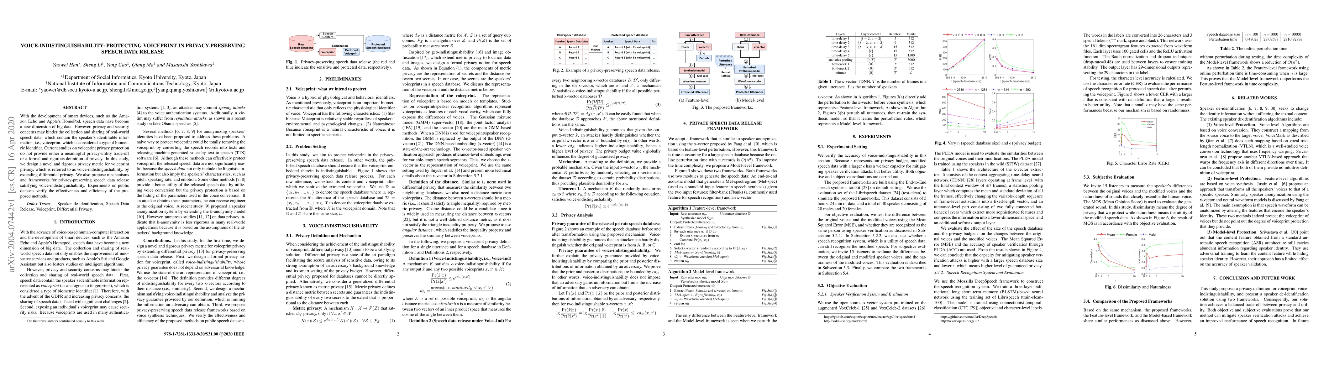 This paper introduces a novel privacy metric called voice-indistinguishability to protect voiceprints in speech data release, extending differential privacy. It proposes mechanisms ensuring privacy-preserving speech data sharing, validated through experiments on public datasets.