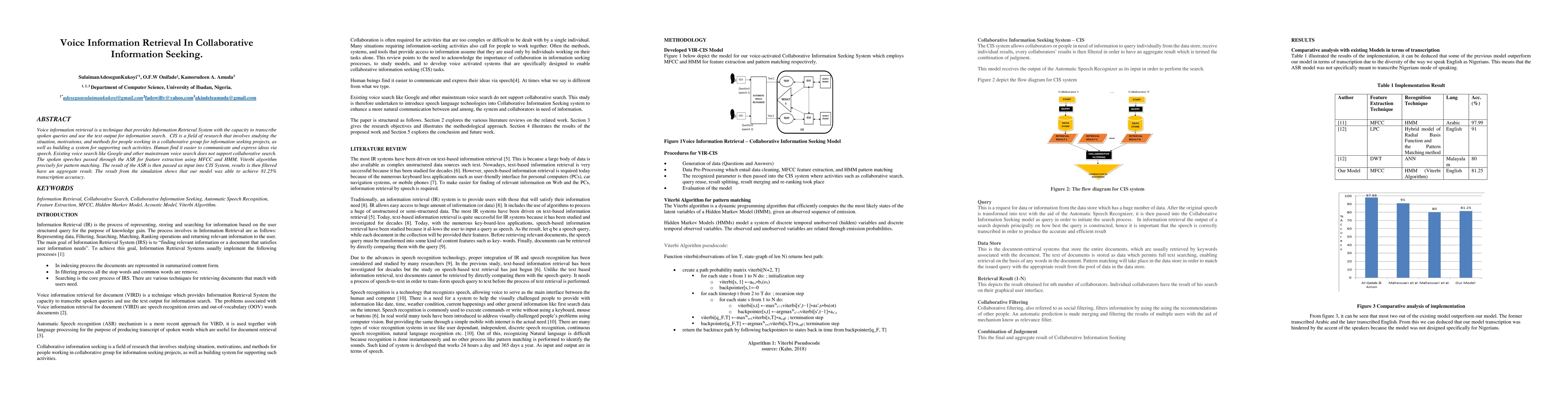 This paper explores voice information retrieval in collaborative information seeking (CIS), introducing a system that transcribes spoken queries using ASR and MFCC for feature extraction. The model achieved 81.25% transcription accuracy, aiming to support collaborative search efforts beyond existing voice search systems.